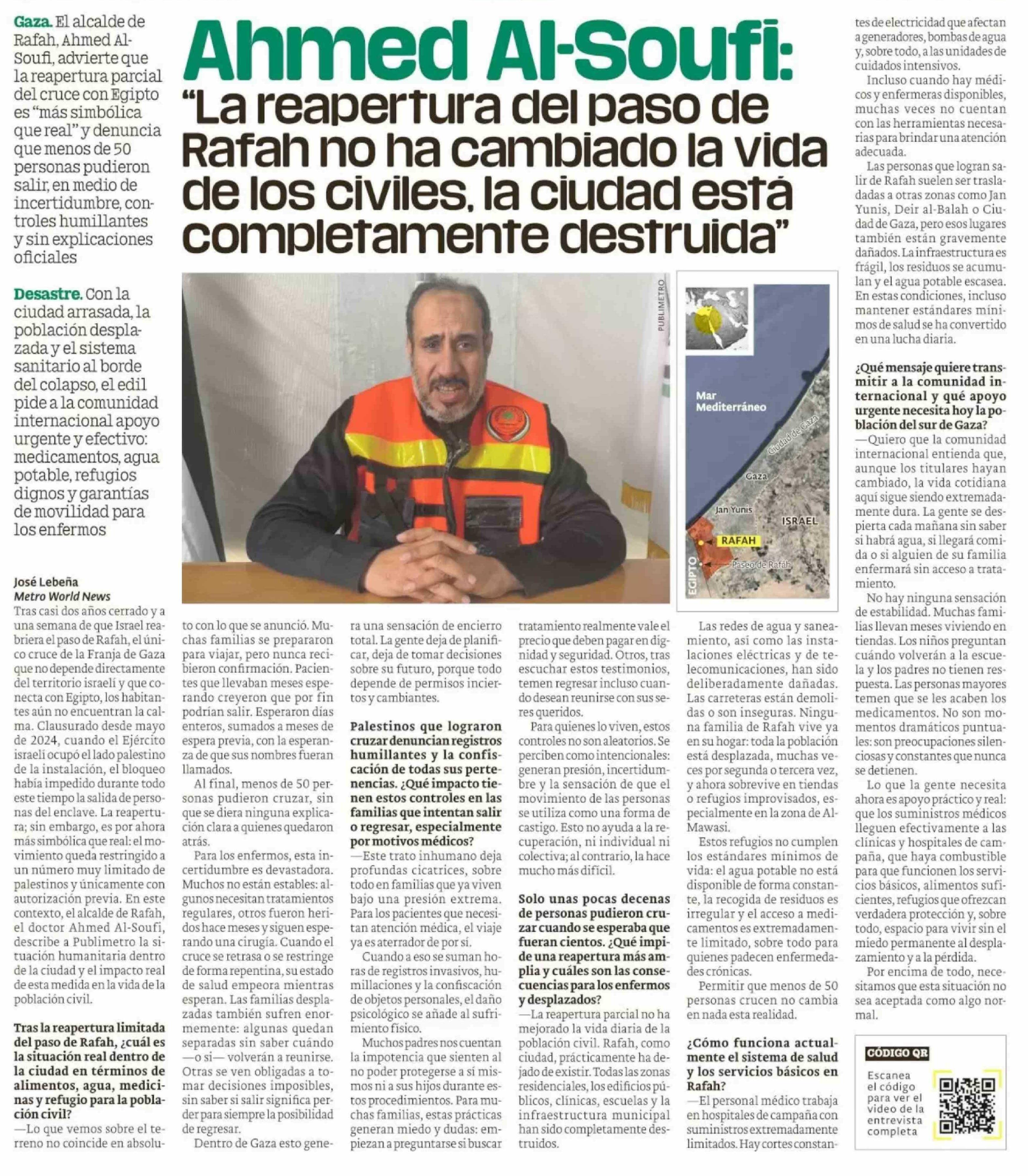 Ahmed Al-Soufi: "La reapertura del paso de Rafah no ha cambiado la vida de los civiles, la ciudad está completamente destruida"