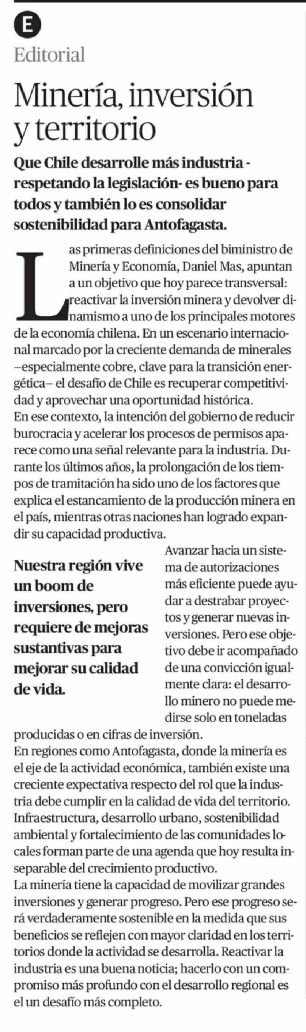Editorial: Minería, inversión y territorio
