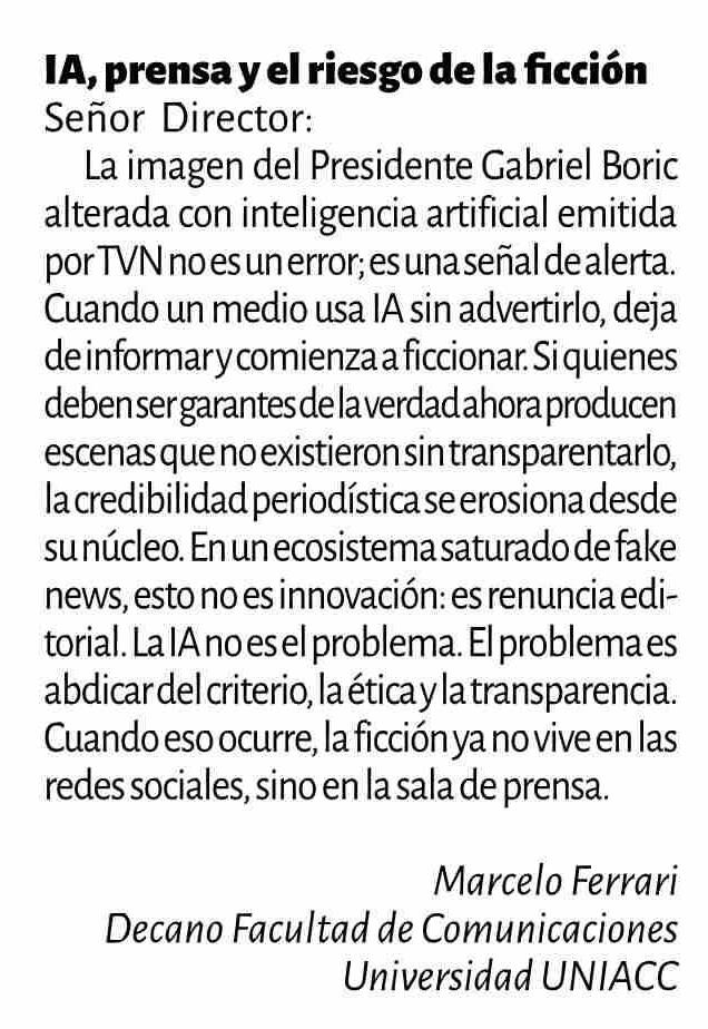 | Título: | Cartas: IA, prensa y el riesgo de la ficción Señor Director: La imagen del Presidente Gabriel Boric alterada con inteligencia artificial emitida por TVN no es un error; es una señal de alerta. Cuando un medio usa IA sin advertirlo, deja de informary comienza a ficcionar. Si quienes debenser garantes |