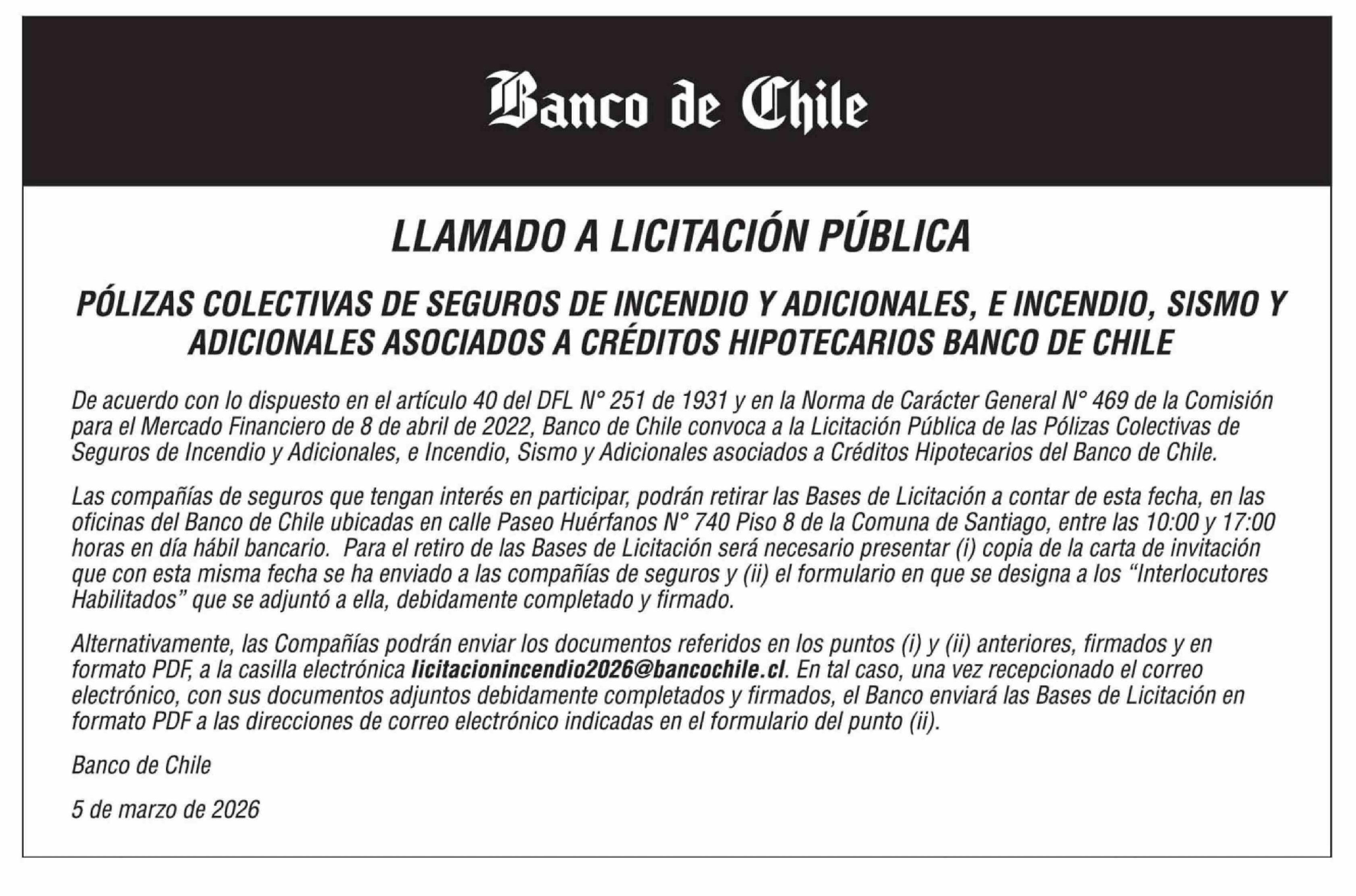 | Título: | AVISO LICITACIONES: PÓLIZAS COLECTIVAS DE SEGUROS DE INCENDIO Y ADICIONALES, E INCENDIO, SISMO Y ADICIONALES ASOCIADOS A CREDITOS HIPOTECARIOS BANCO DE CHILE |