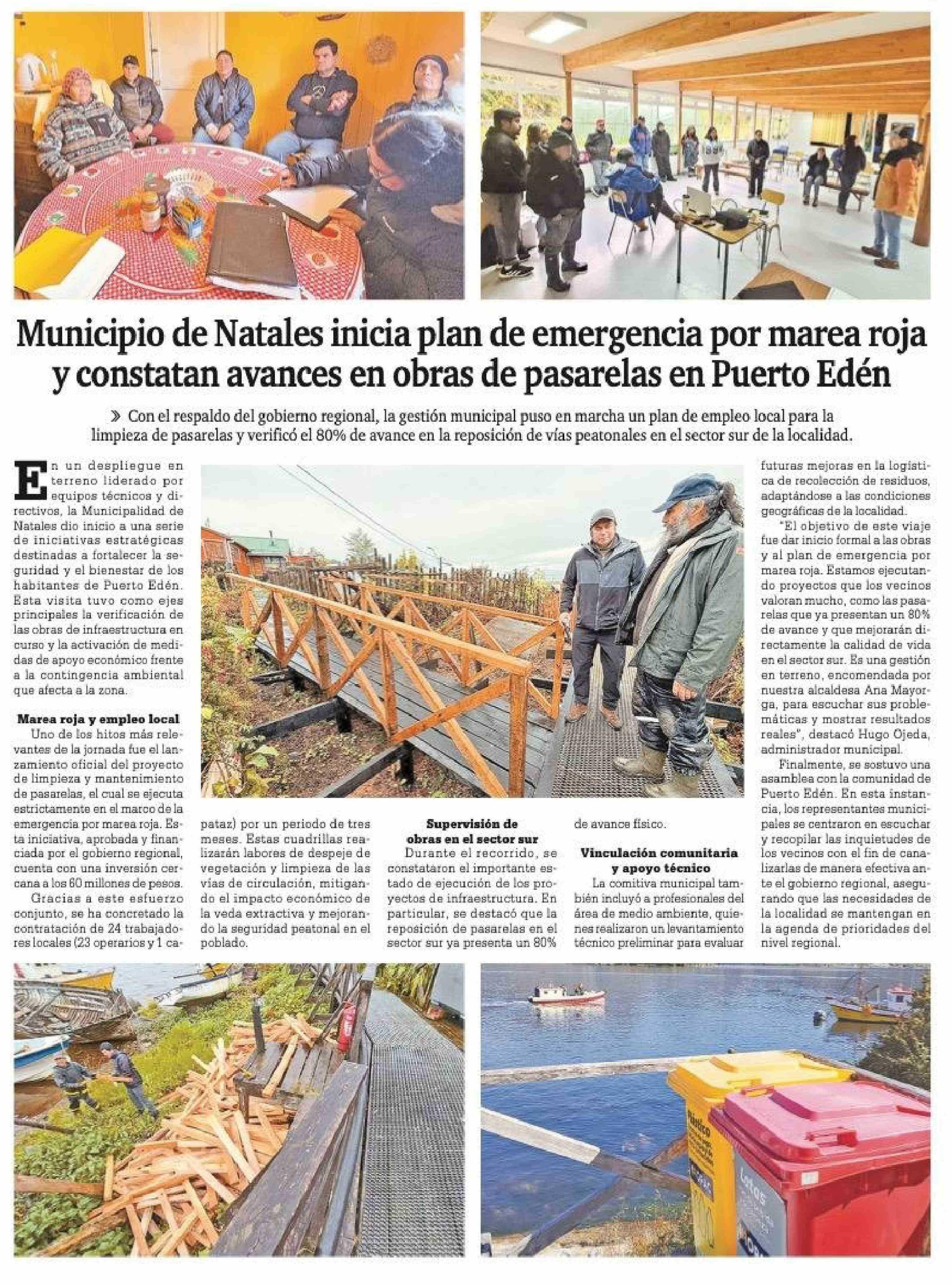 Título: Municipio de Natales inicia plan de emergencia por marea roja y constatan avances en obras de pasarelas en Puerto Edén