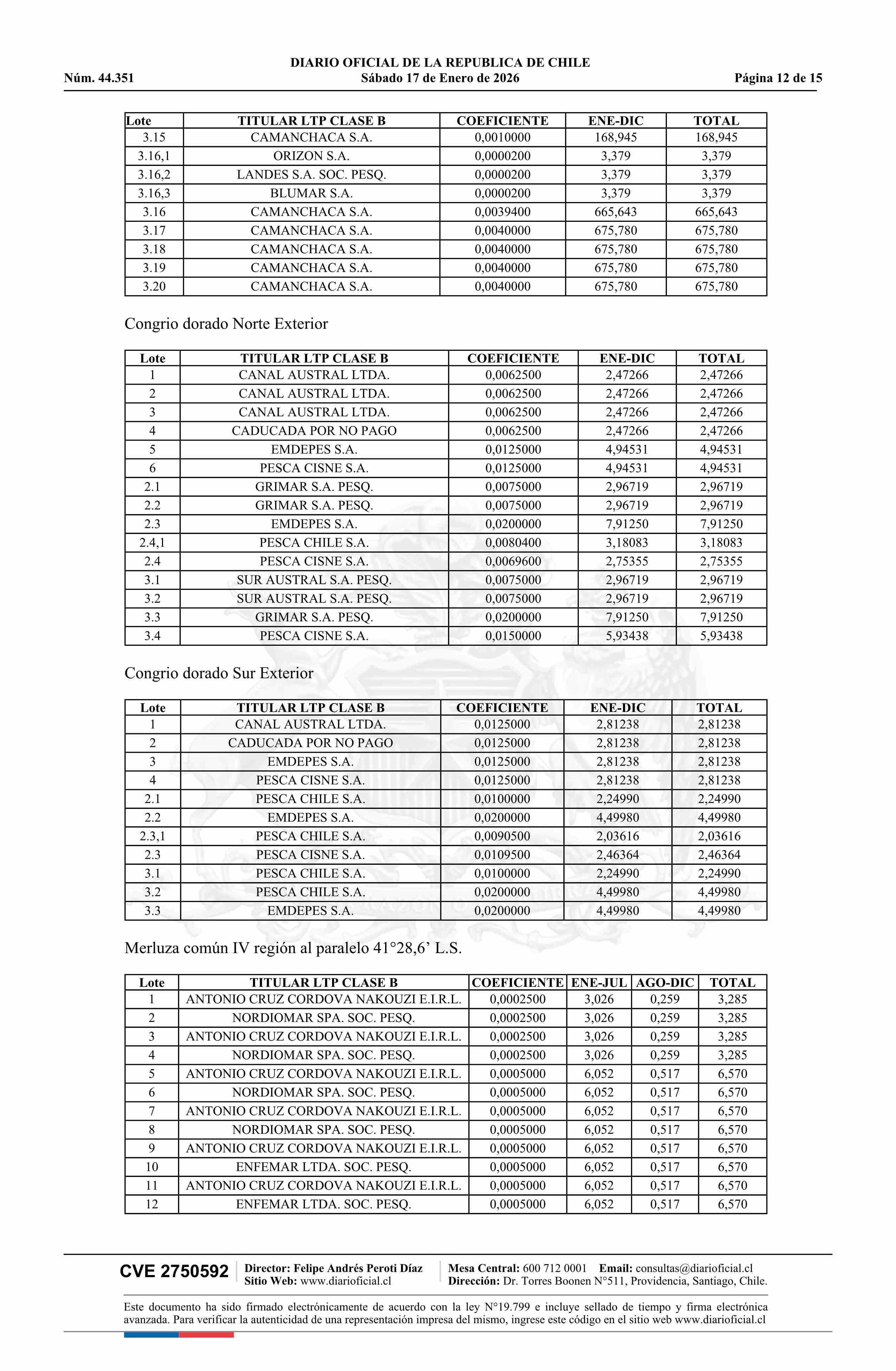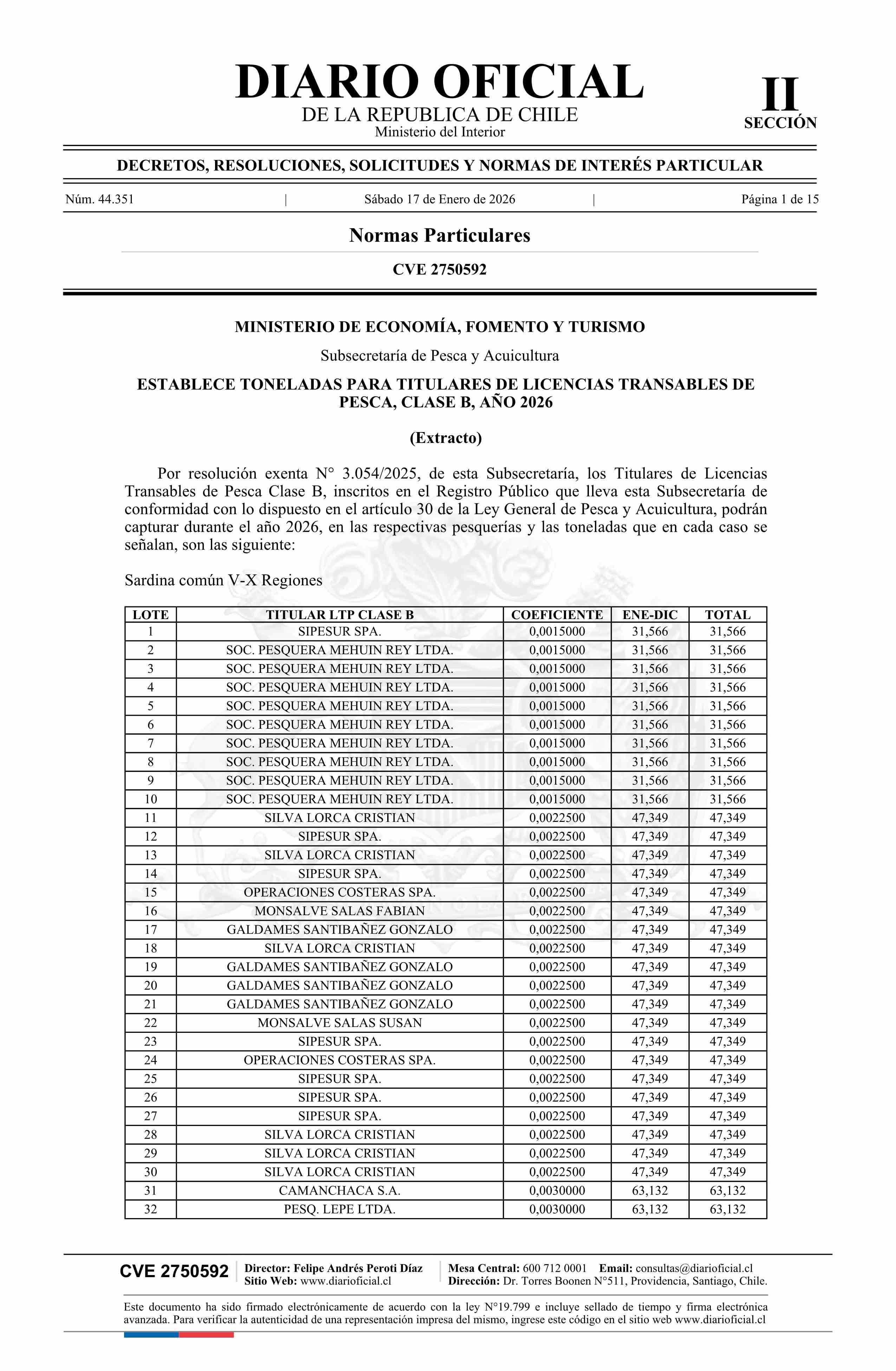 | Título: | Extracto de resolución exenta número 3.054, de 2025.- Establece toneladas para titulares de Licencias Transables de Pesca, Clase B, año 2026 |