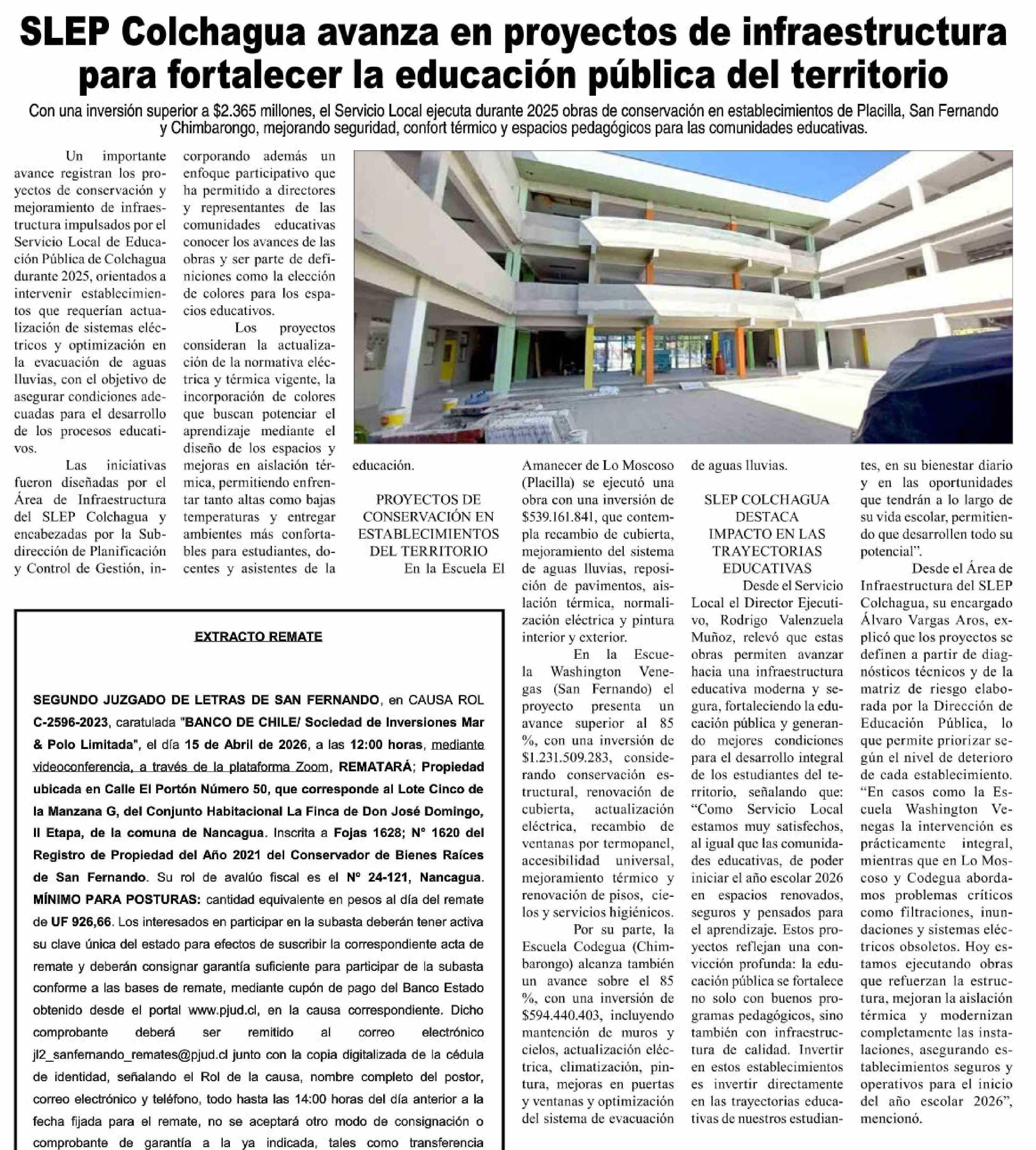 SLEP Colchagua avanza en proyectos de infraestructura para fortalecer la educación pública del territorio