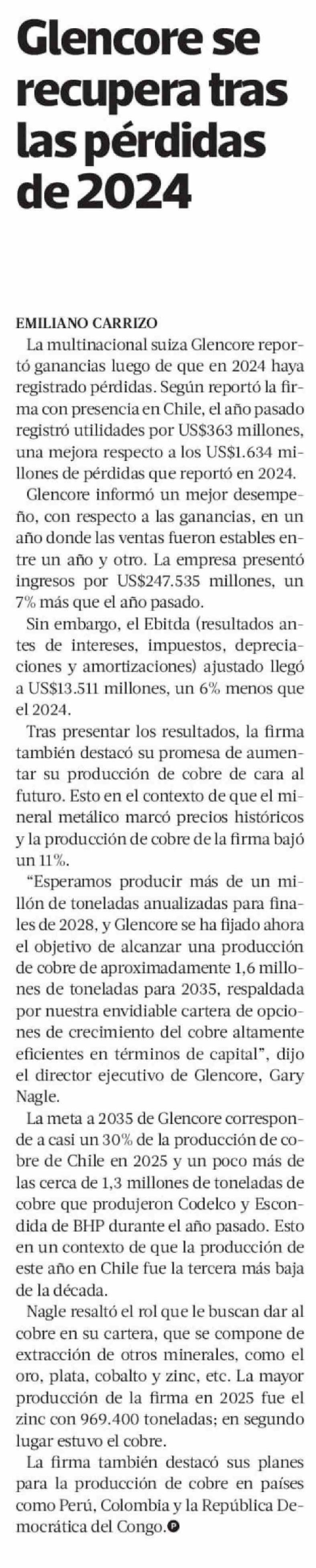 Glencore se recupera tras las pérdidas de 2024
