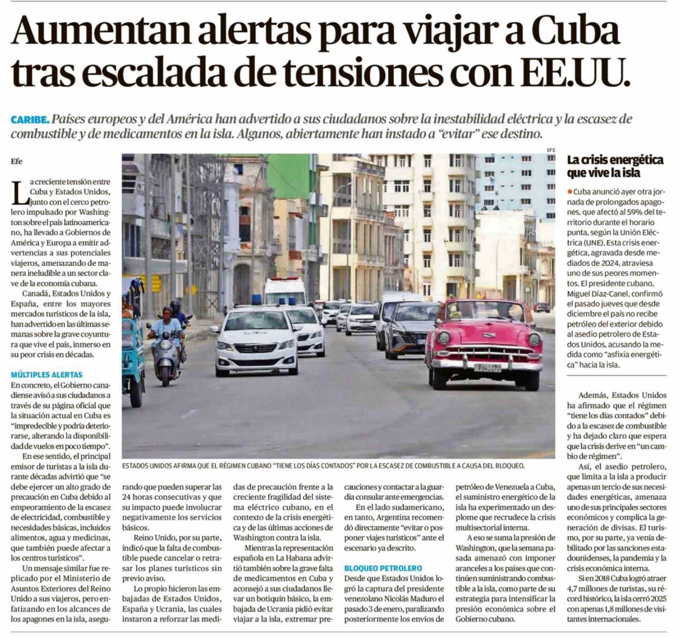 Aumentan alertas para viajar a Cuba tras escalada de tensiones con EE.UU.