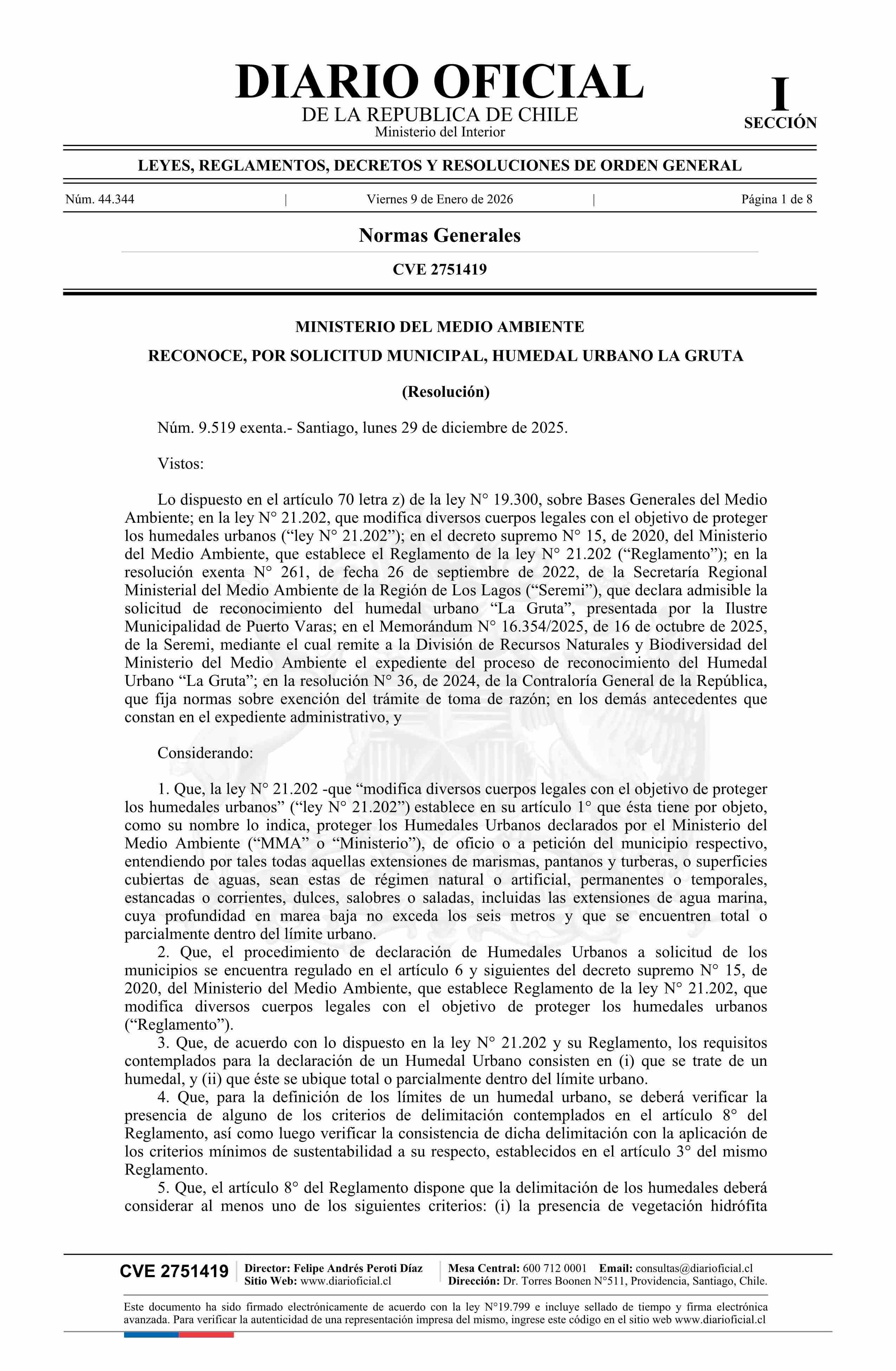 | Título: | AVISO LICITACIONES: Resolución exenta número 9.519, de 2025.- Reconoce, por solicitud municipal, humedal urbano La Gruta |