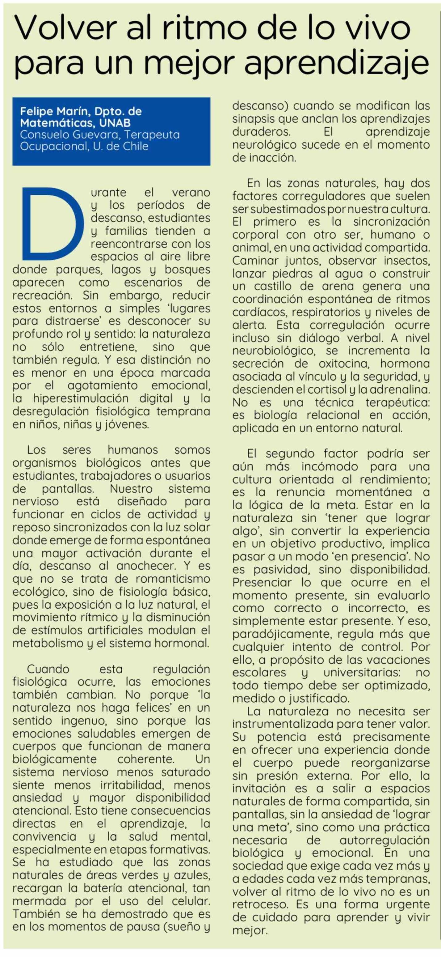 Columnas de Opinión: Volver al ritmo de lo vivo para un mejor aprendizaje