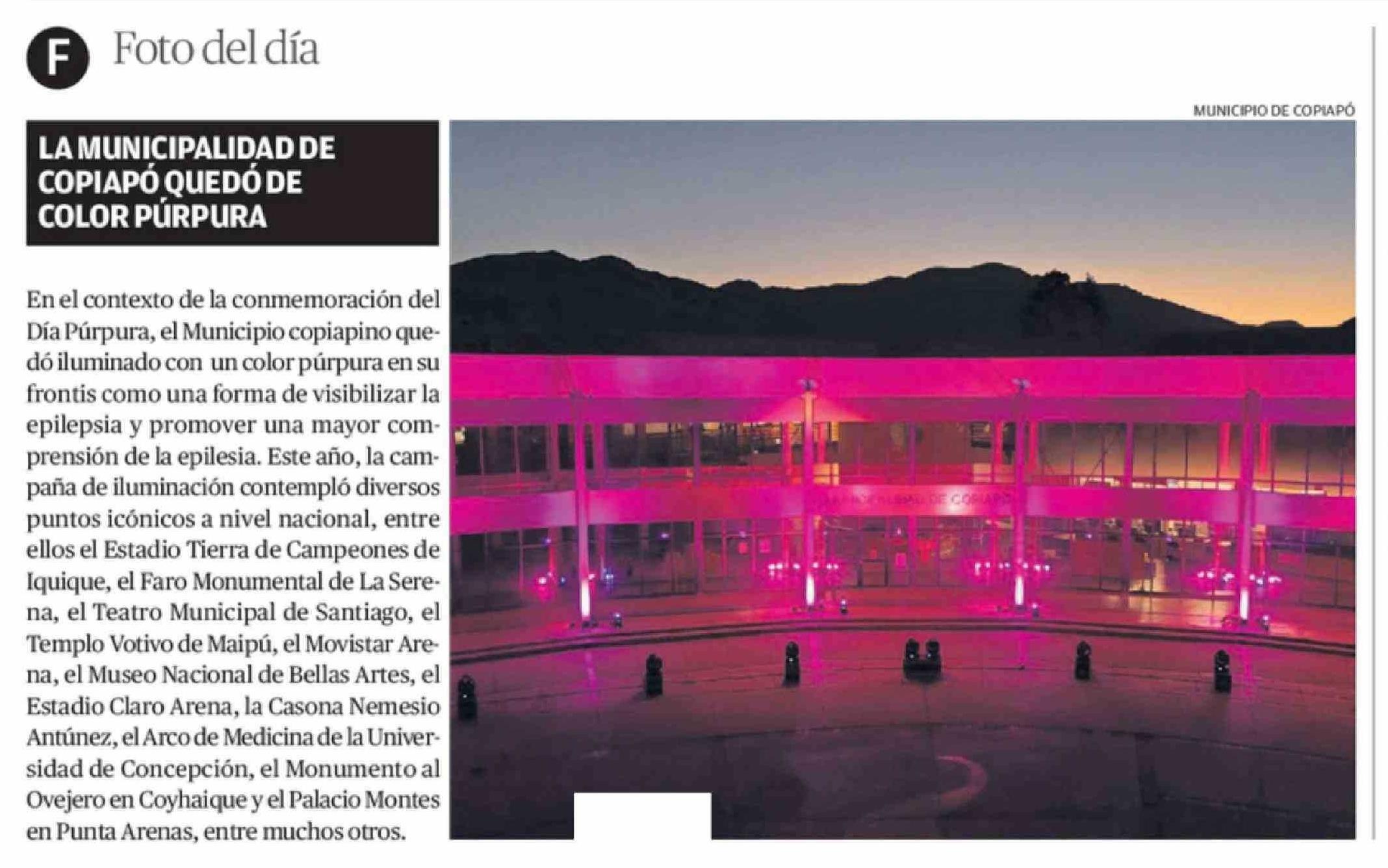 Título: En el contexto de la conmemoración del Día Púrpura, el Municipio copiapino quedó iluminado con un color púrpura en su frontis como una forma de visibilizar la epilepsia y promover una mayor comprensión de la epilesia. Este año, la campaña de iluminación contempló diversos puntos icónicos a nivel nac