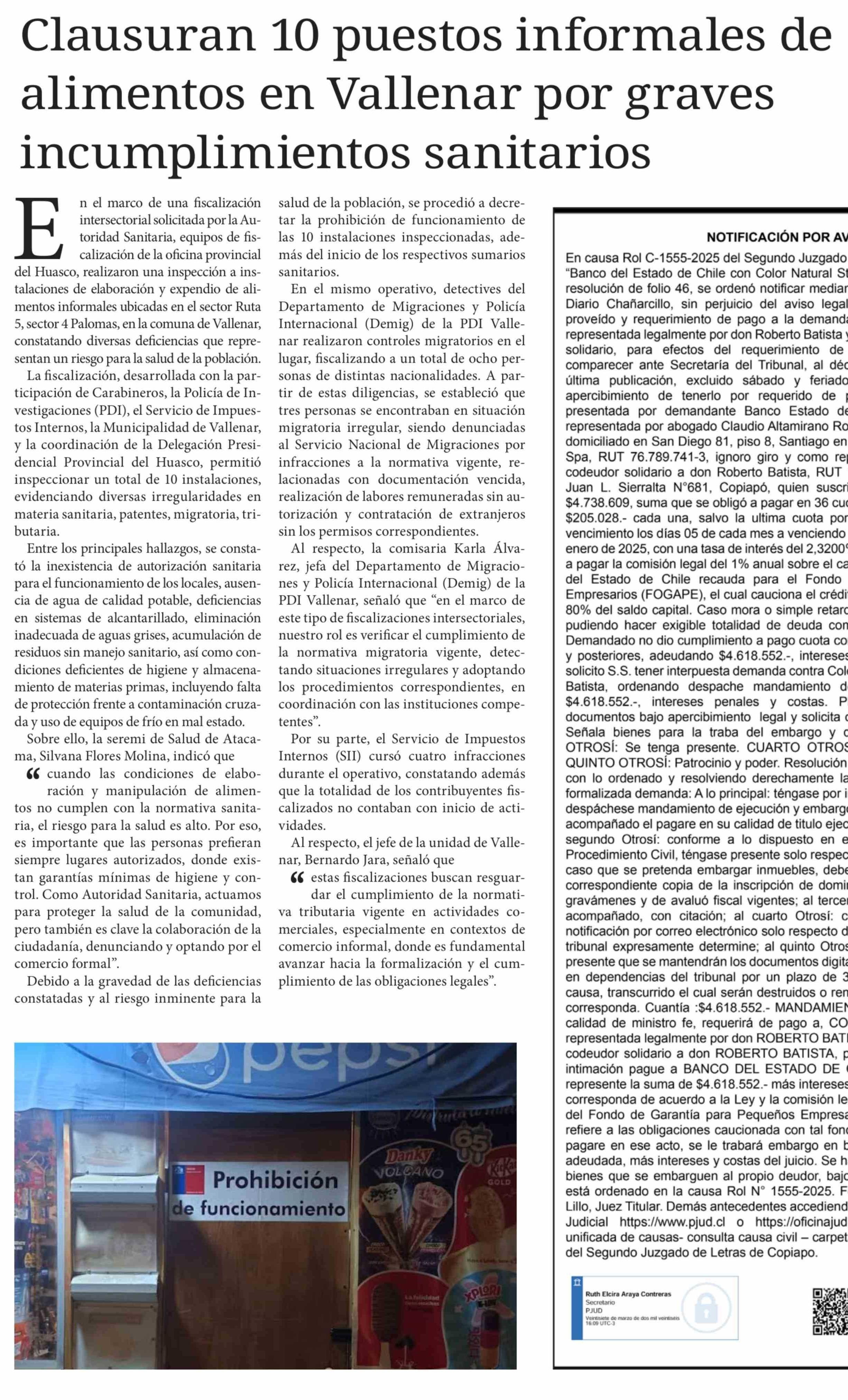 Clausuran 10 puestos informales de alimentos en Vallenar por graves incumplimientos sanitarios