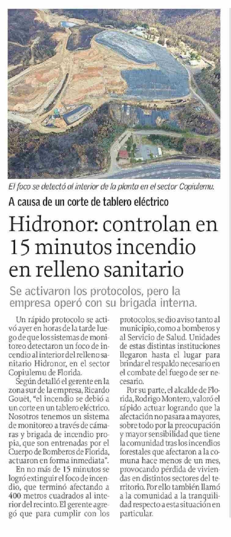 Hidronor: controlan en 15 minutos incendio en relleno sanitario