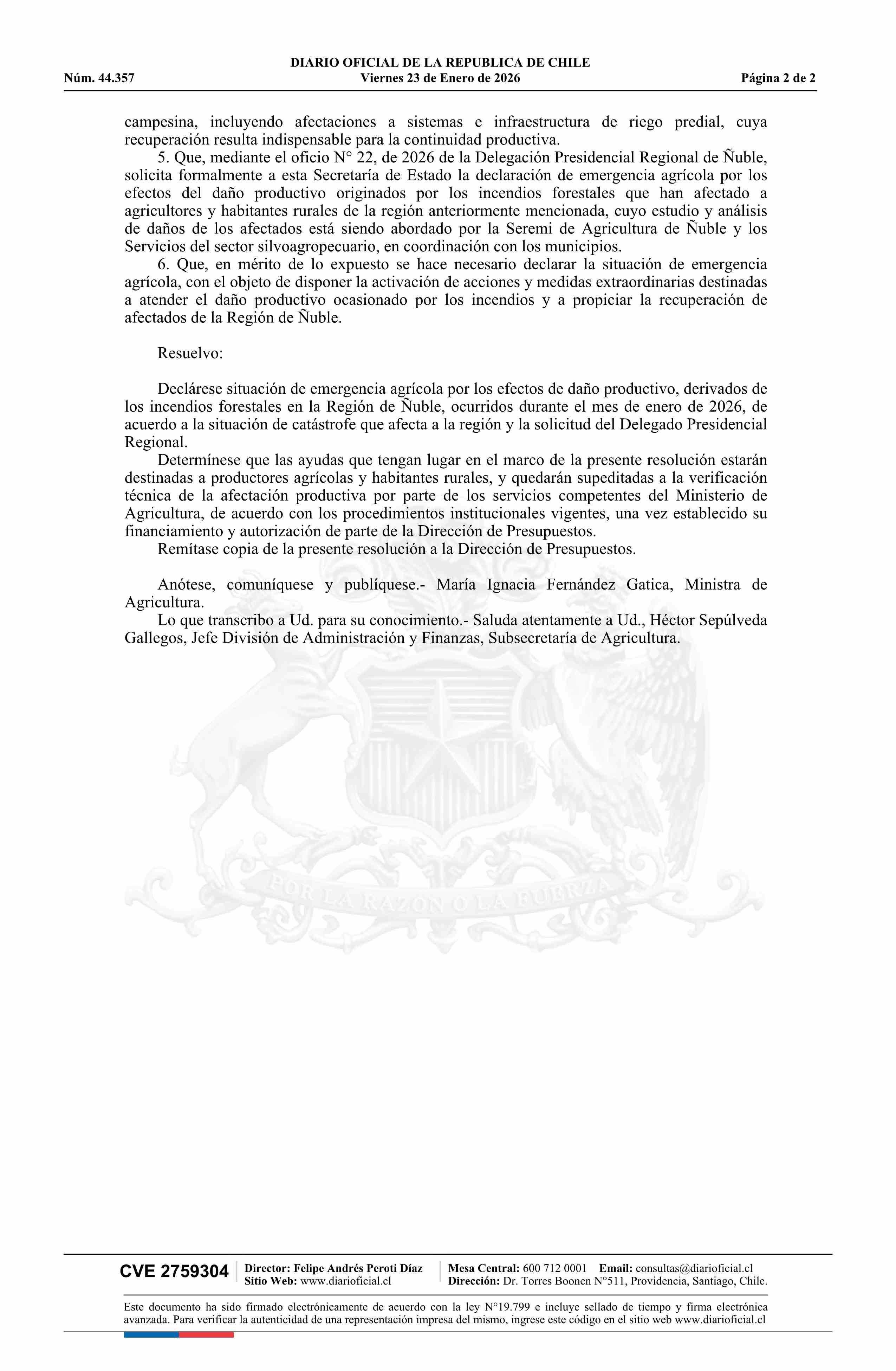 | Título: | Resolución exenta número 41, de 2026.- Declara situación de emergencia agrícola por los efectos de daño productivo derivados de los incendios forestales en la Región de Ñuble |