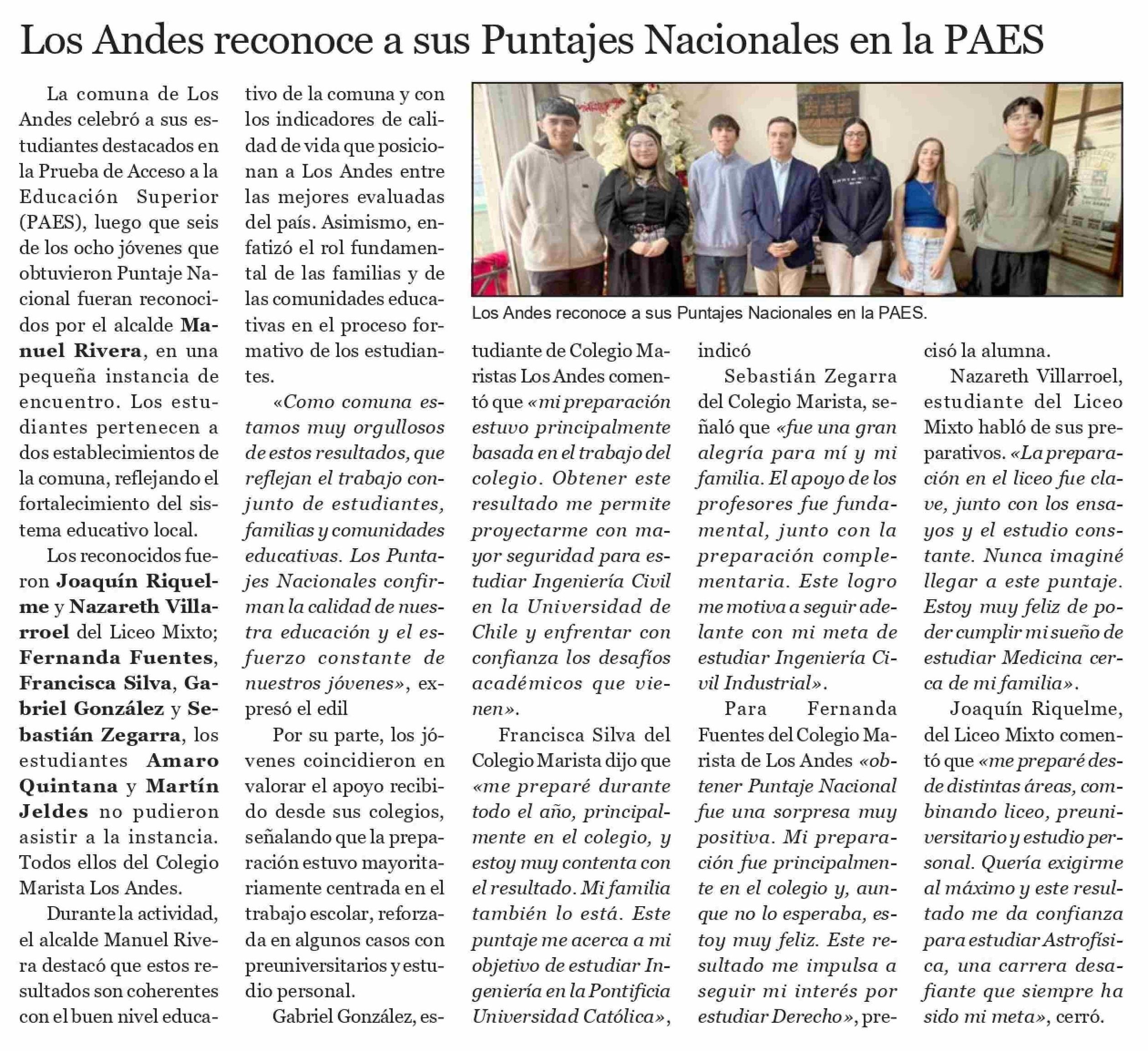 Los Andes reconoce a sus Puntajes Nacionales en la PAES