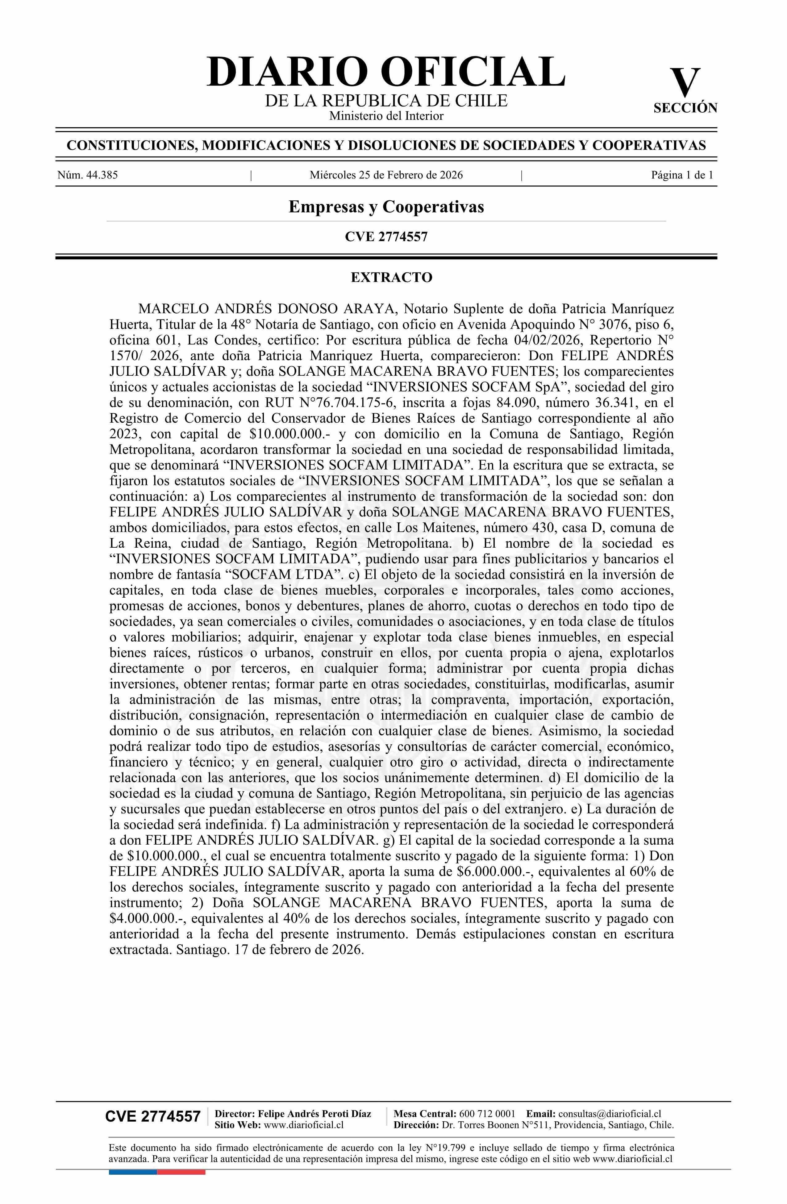 INVERSIONES SOCFAM SpA 76.704.175-6*