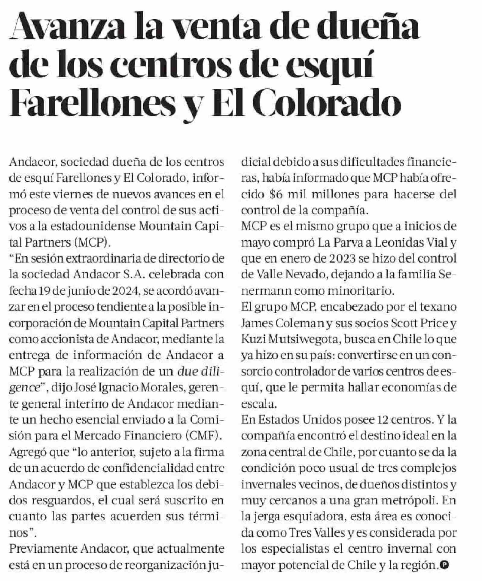 Avanza la venta de dueña de los centros de esquí Harellones y El Colorado