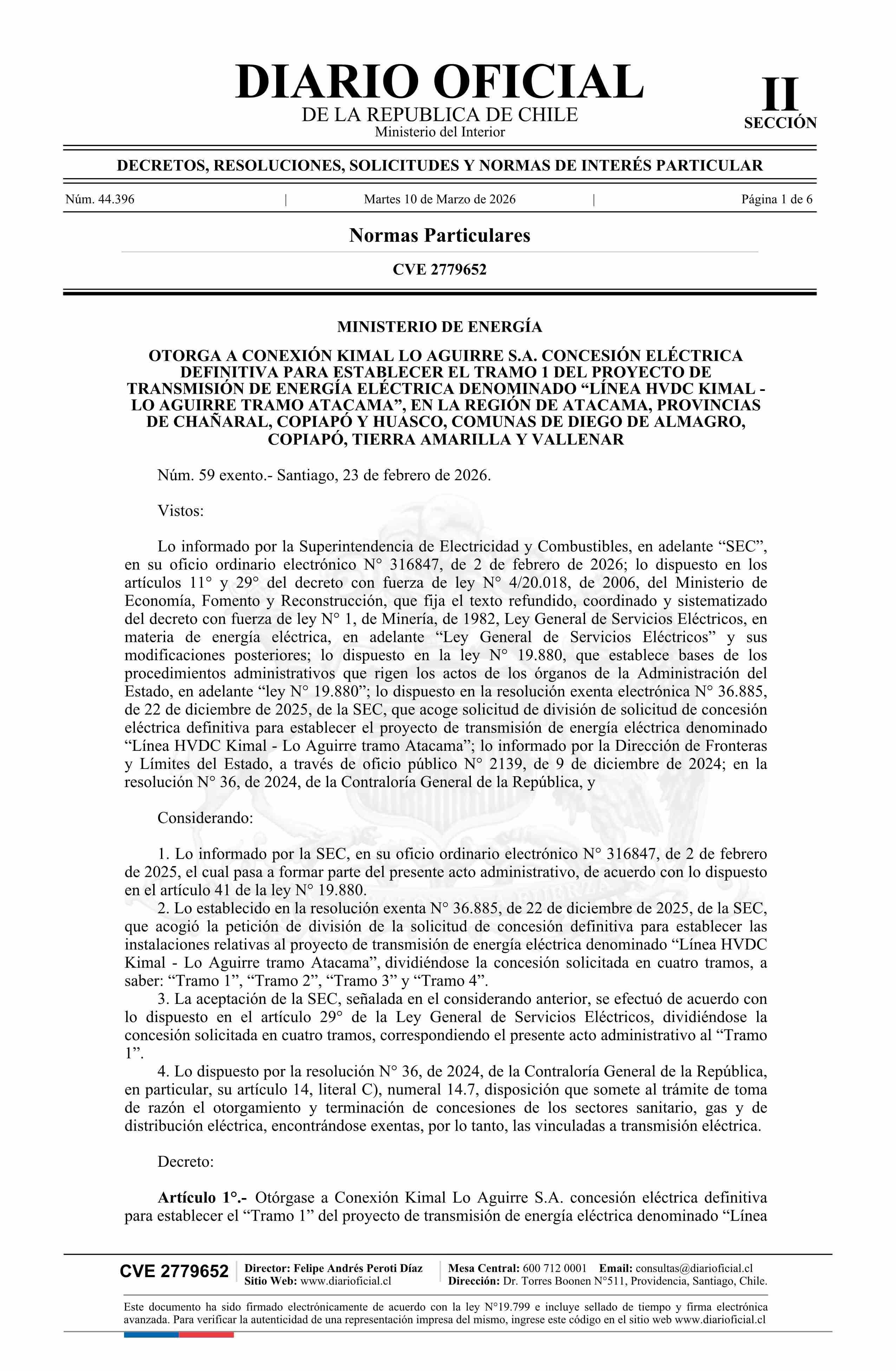 | Título: | Decreto exento número 59, de 2026.- Otorga a Conexión Kimal Lo Aguirre S.A. concesión eléctrica definitiva para establecer el Tramo 1 del proyecto de transmisión de energía eléctrica denominado Línea HVDC Kimal - Lo Aguirre Tramo Atacama, en la Región de Atacama, provincias de Chañaral, Copiapó y Hu |