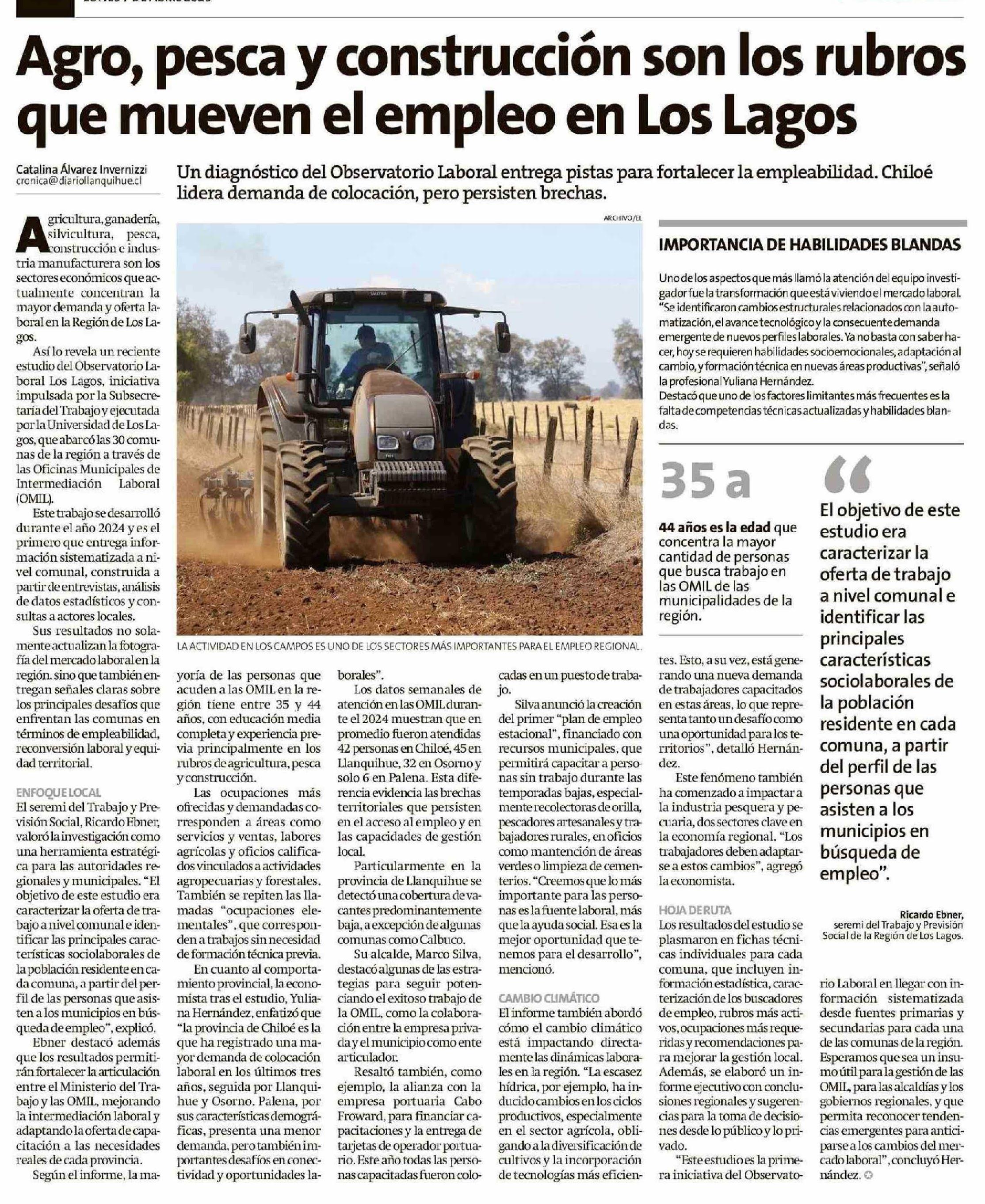 Agro, pesca y construcción son los rubros que mueven el empleo en Los Lagos