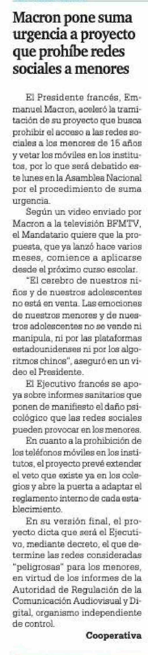 Macron pone suma urgencia a proyecto que prohíbe redes sociales a menores
