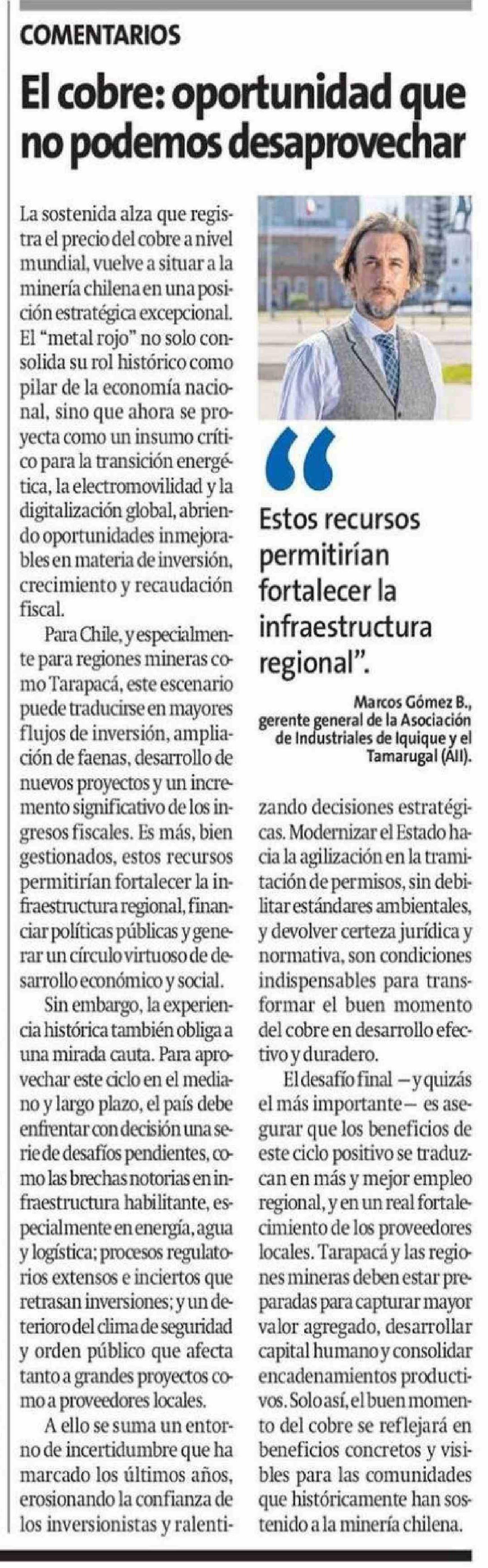 Columnas de Opinión: El cobre: oportunidad que no podemos desaprovechar