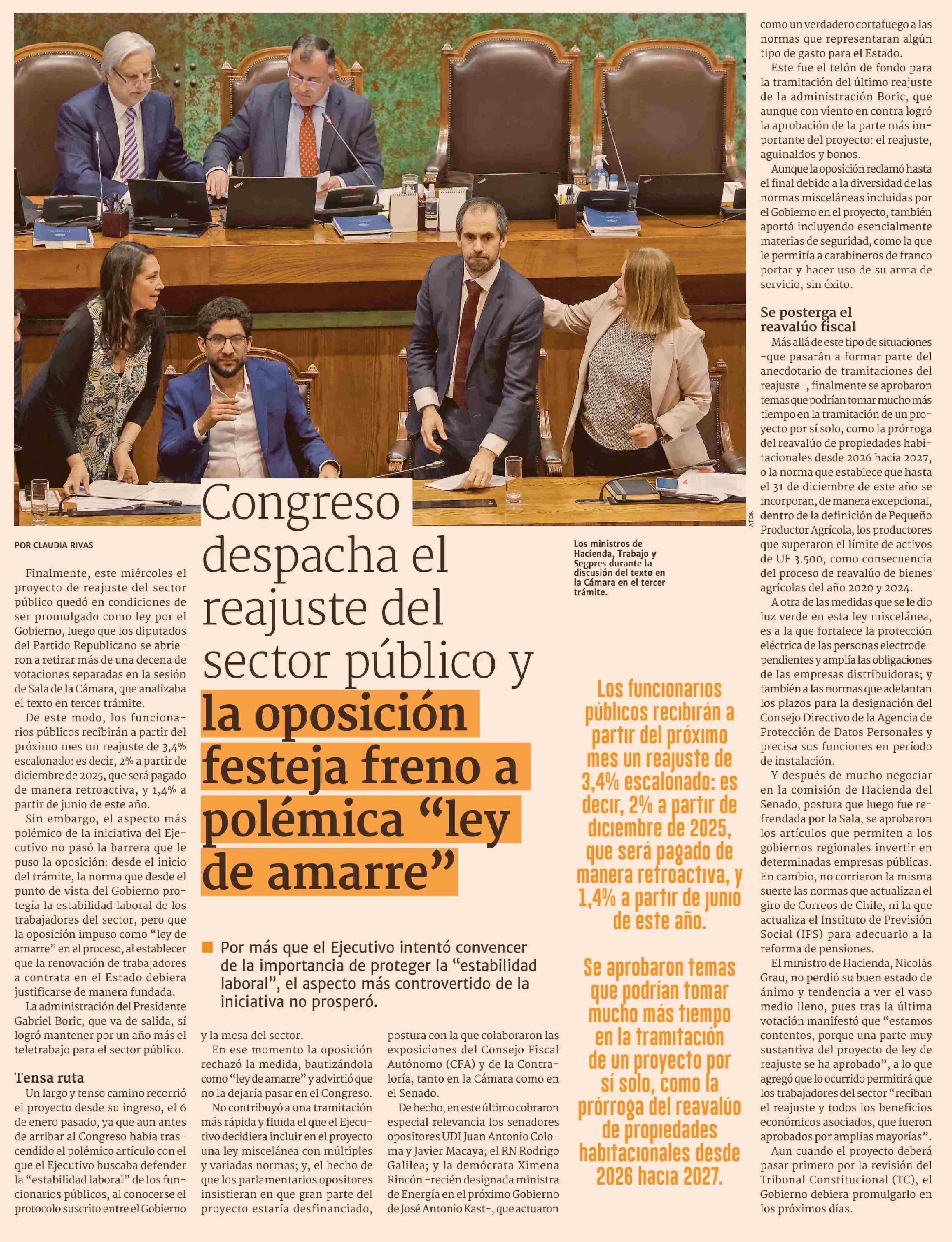 Congreso despacha el reajuste del sector público y la oposición festeja freno a polémica "ley de amarre"