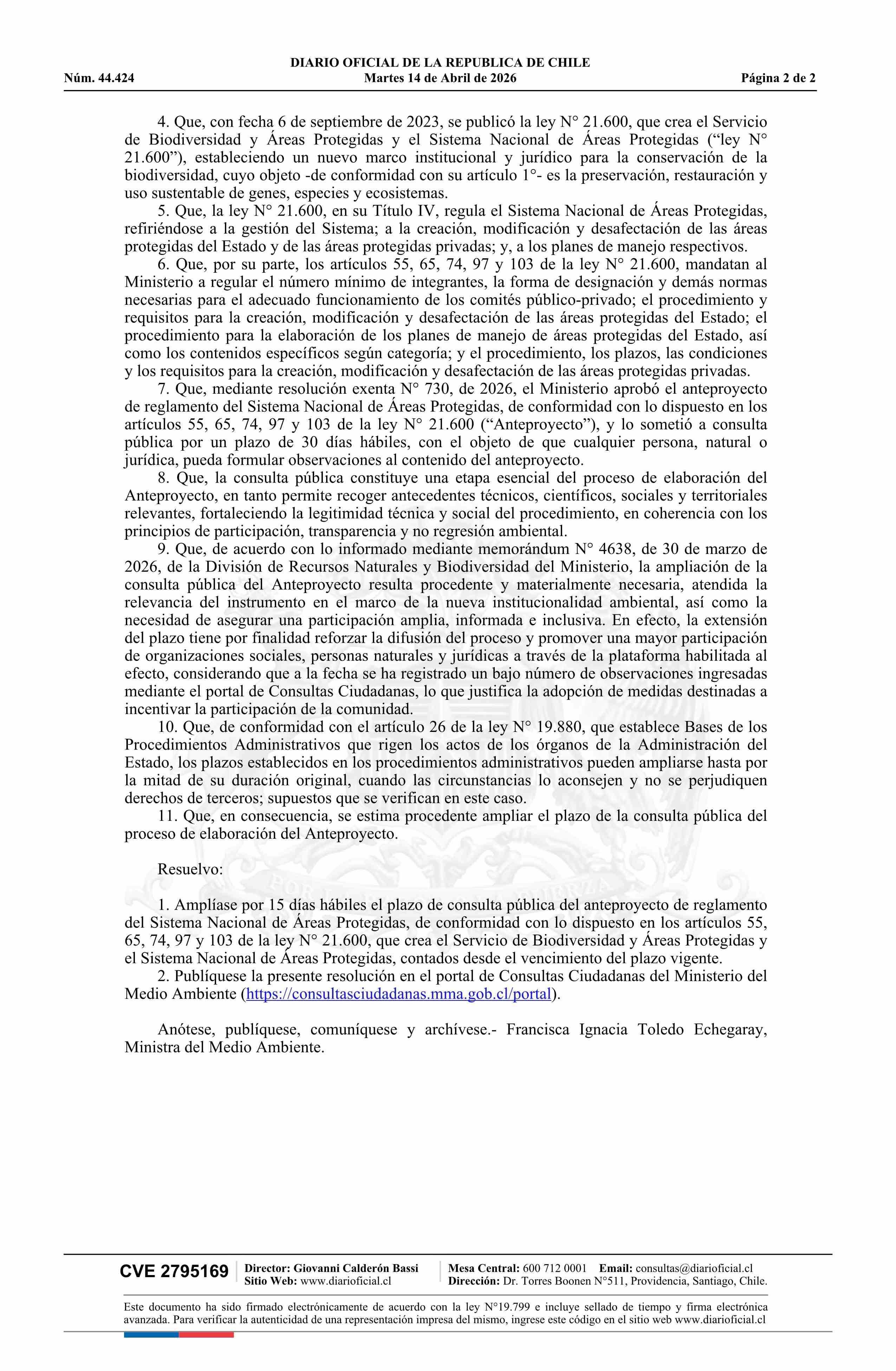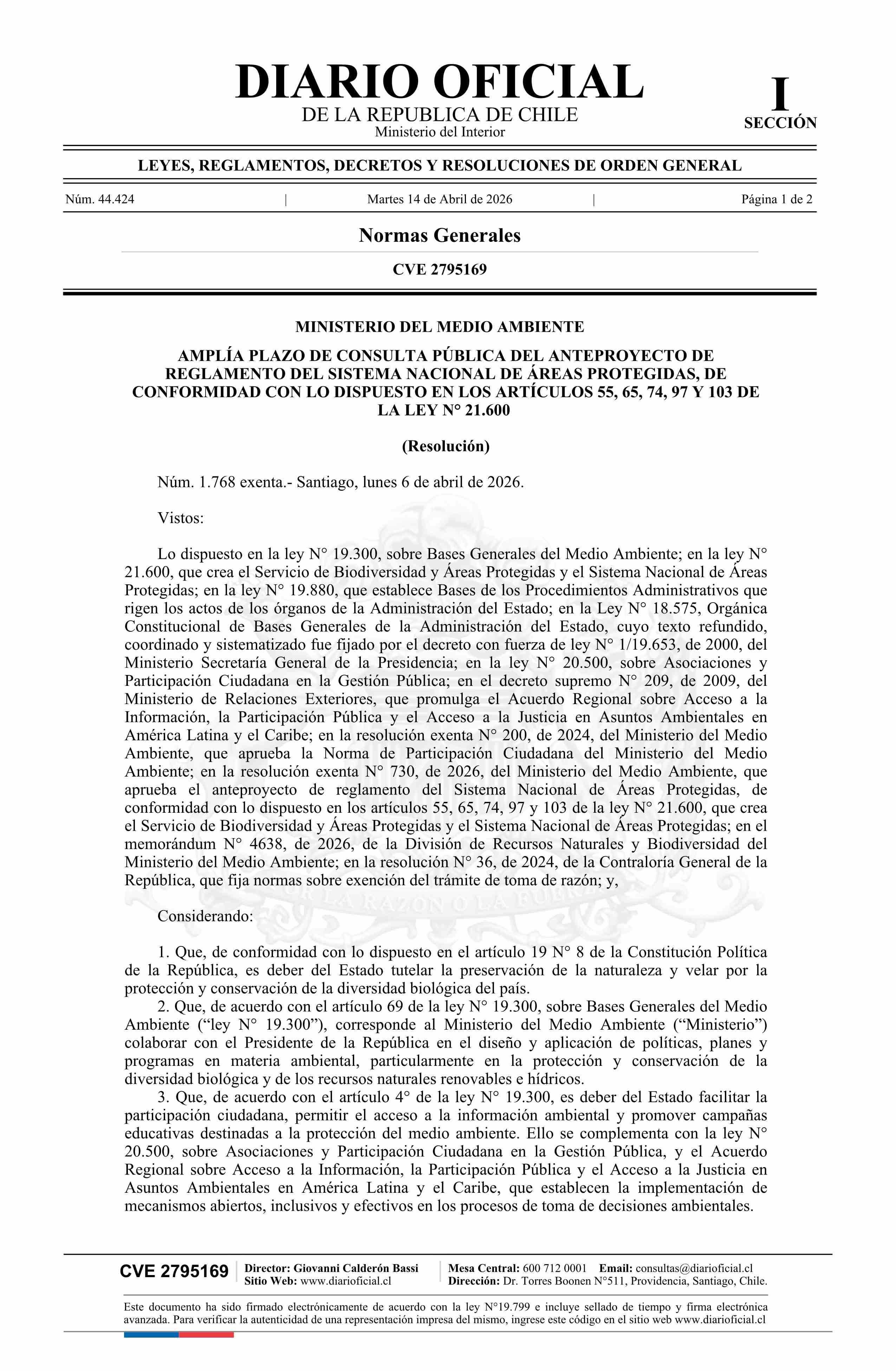 | Título: | Resolución exenta número 1.768, de 2026.- Amplía plazo de consulta pública del anteproyecto de reglamento del Sistema Nacional de Áreas Protegidas, de conformidad con lo dispuesto en los artículos 55, 65, 74, 97 y 103 de la ley N° 21.600 |