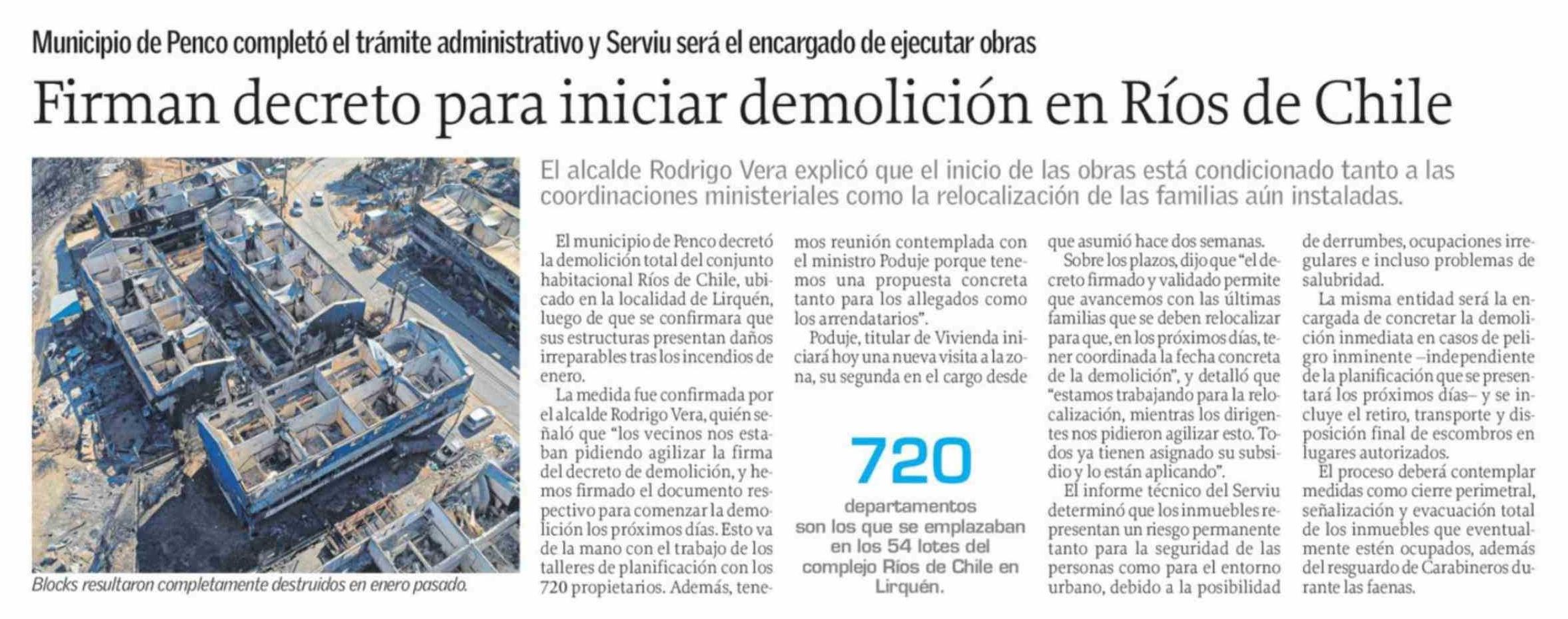 Firman decreto para iniciar demolición en Ríos de Chile