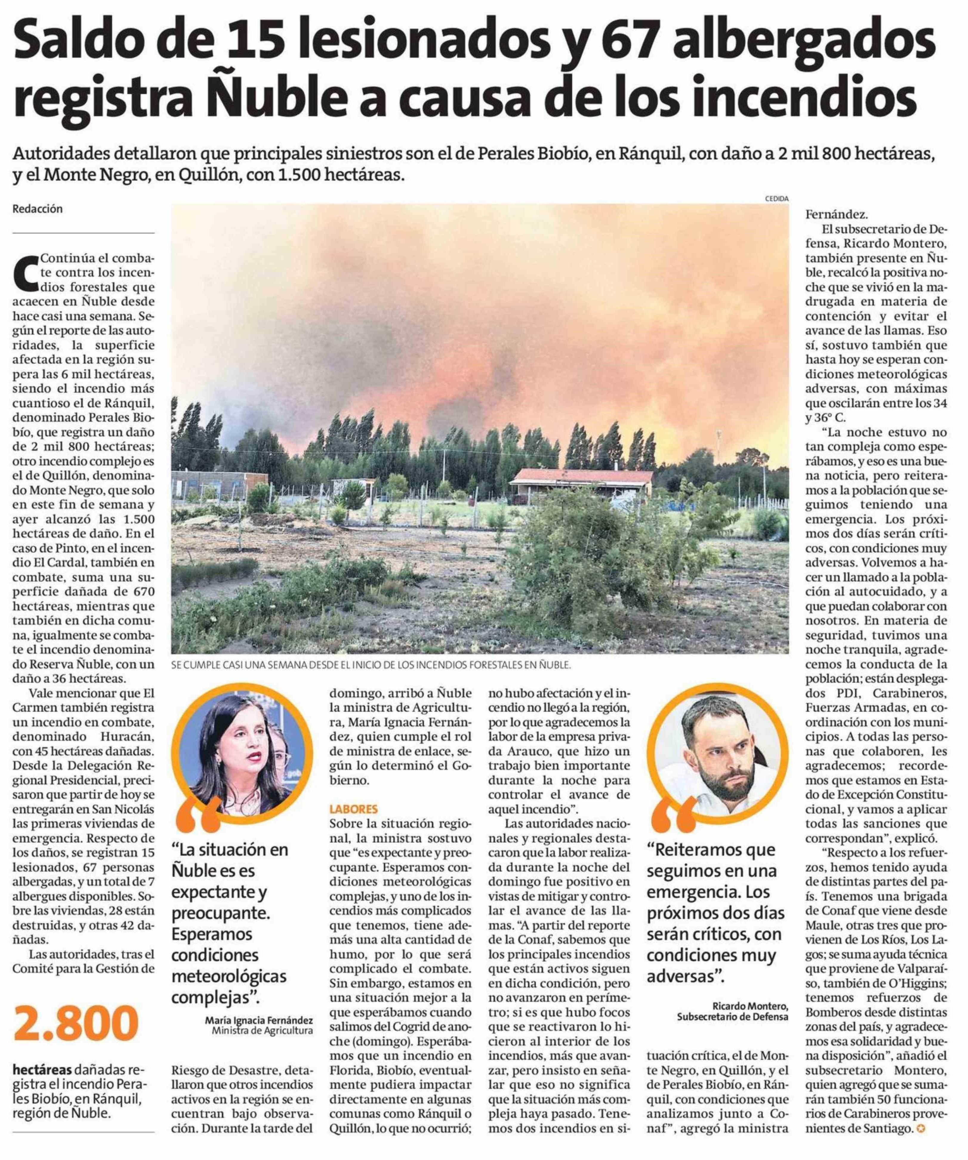 Saldo de 15 lesionados y 67 albergados registra Nuble a causa de los incendios