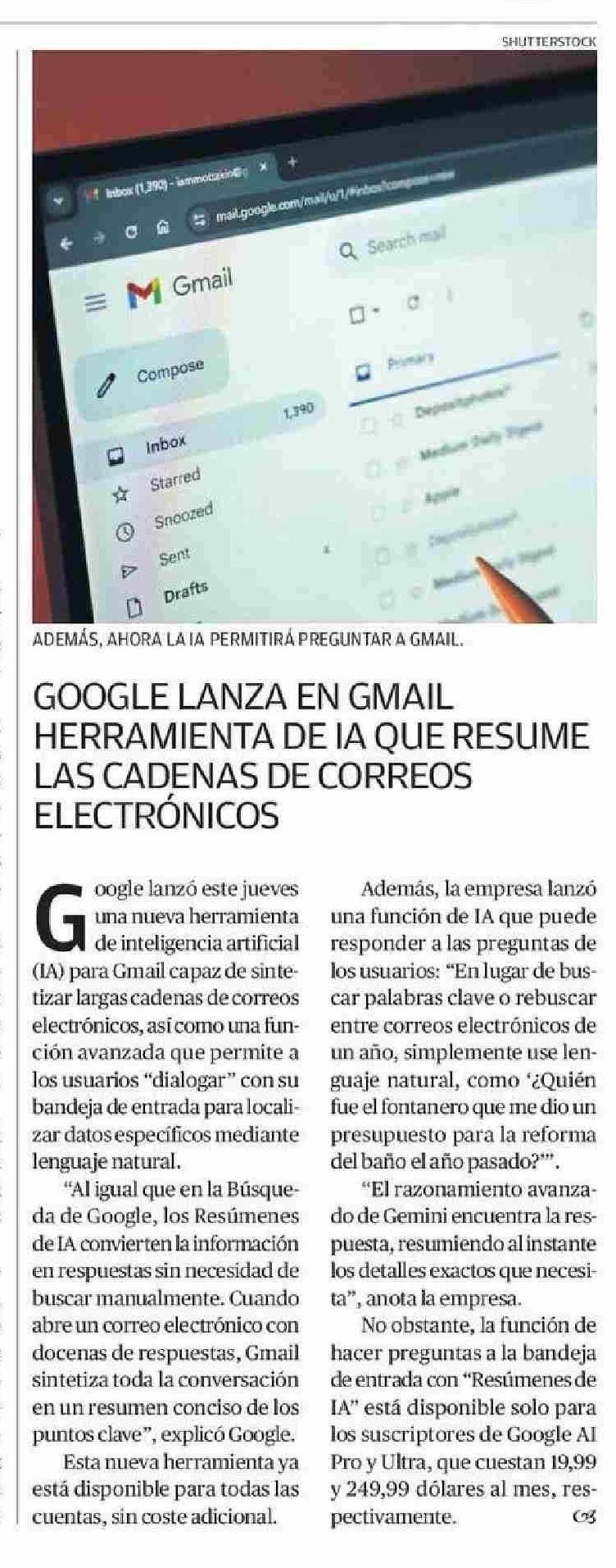 GOOGLE LANZA EN GMAIL HERRAMIENTA DE IA QUE RESUME LAS CADENAS DE CORREOS ELECTRÓNICOS