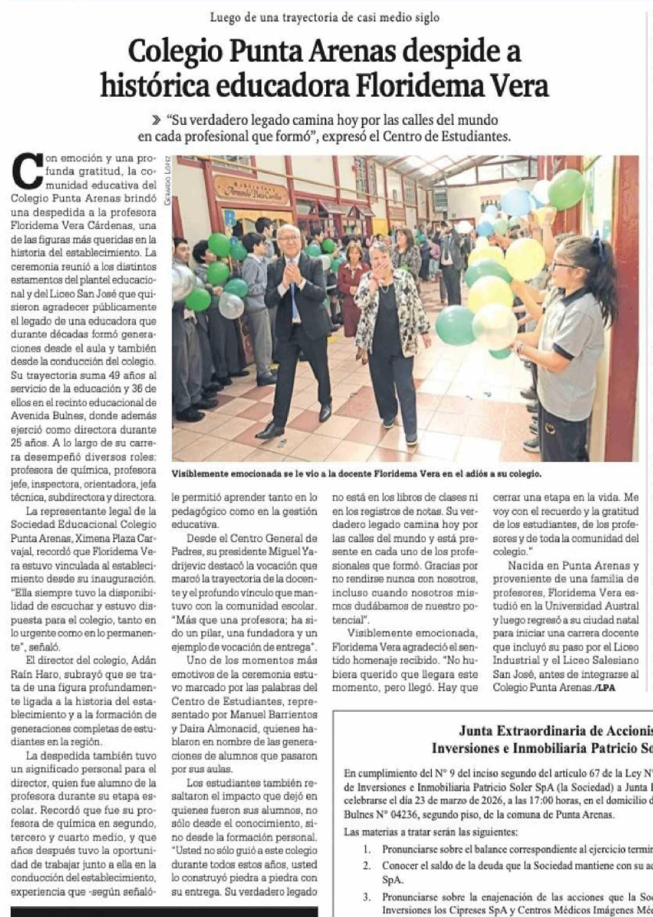 Colegio Punta Arenas despide a histórica educadora Floridema Vera