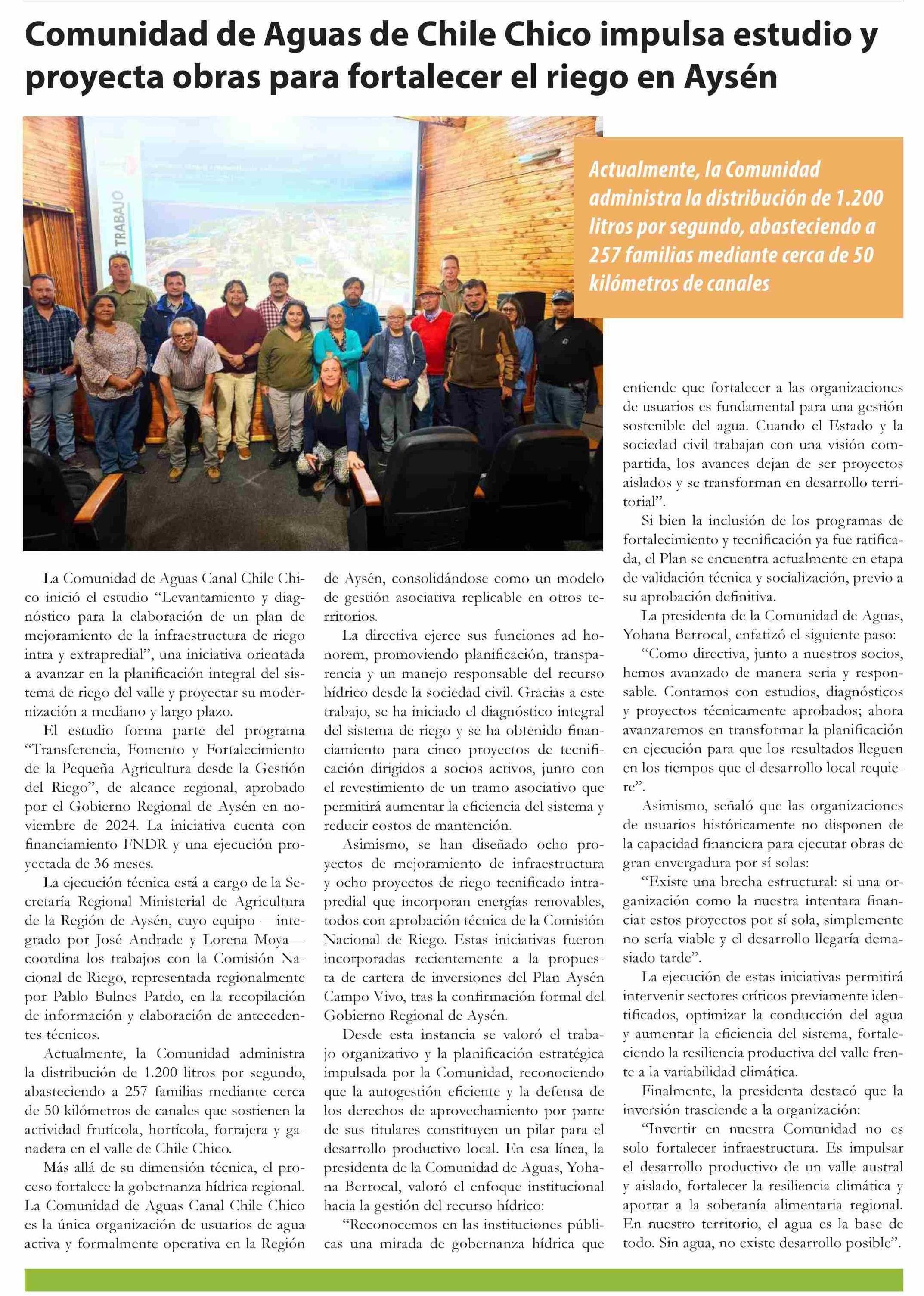 Comunidad de Aguas de Chile Chico impulsa estudio y proyecta obras para fortalecer el riego en Aysén