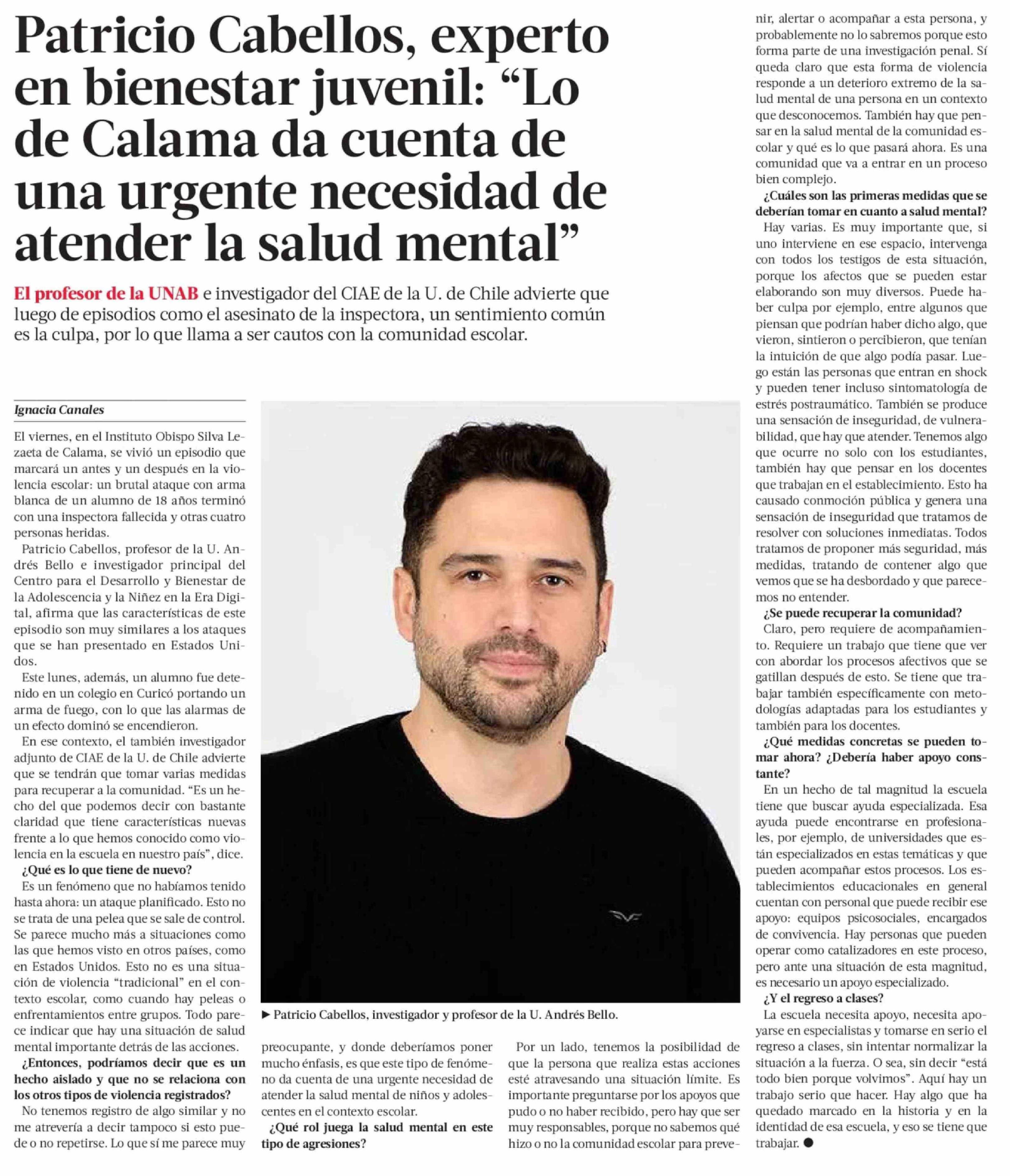 Patricio Cabellos, experto en bienestar juvenil: "Lo de Calama da cuenta de una urgente necesidad de atender la salud mental"