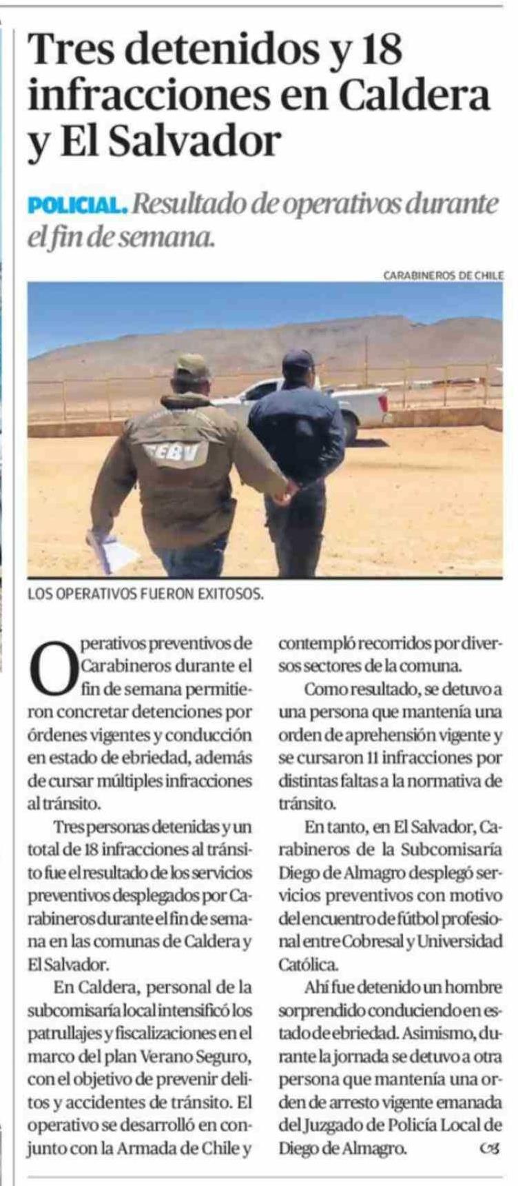 Tres detenidos y 18 infracciones en Caldera y El Salvador