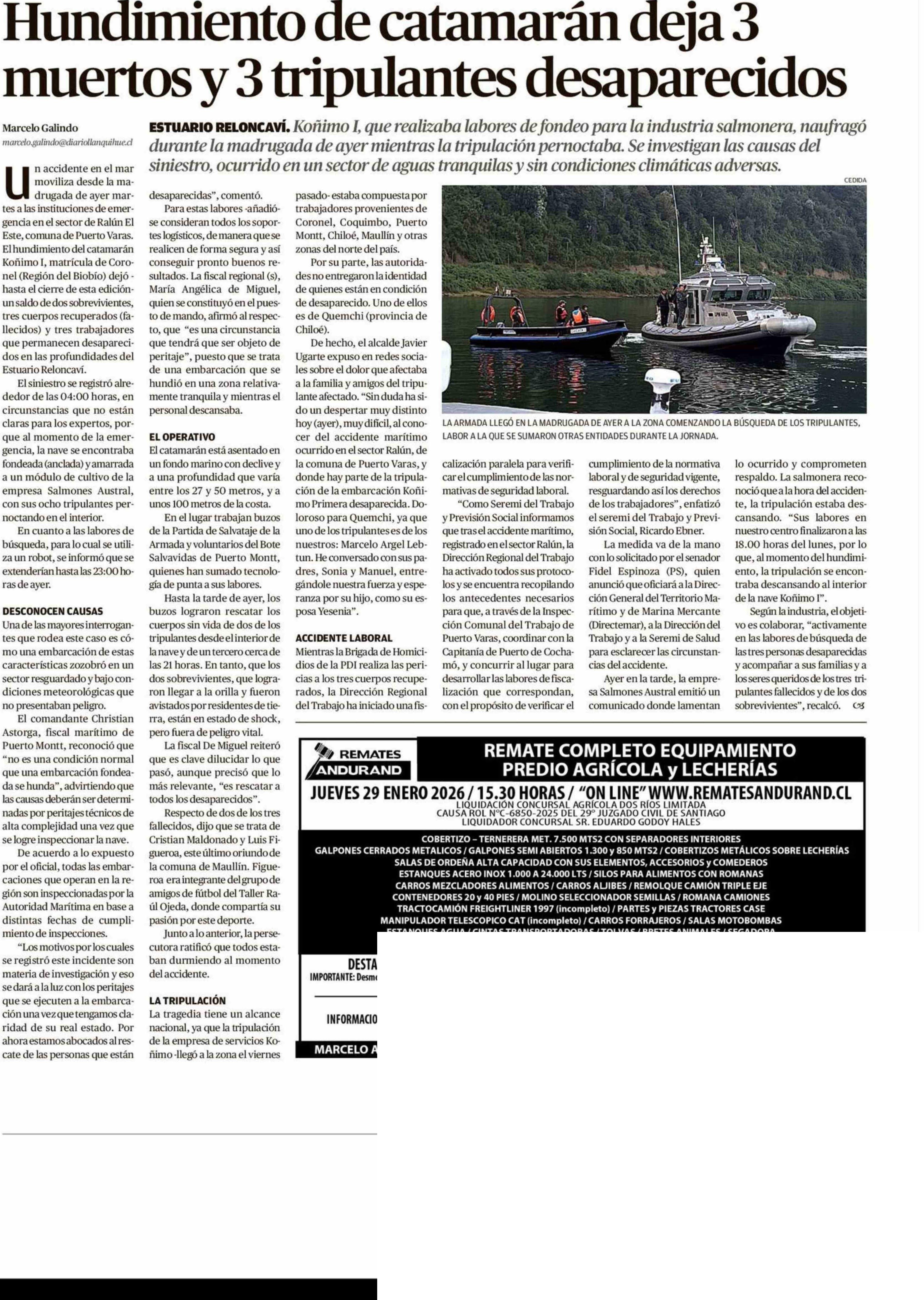 Hundimiento de catamarán deja 3 muertos y 3 tripulantes desaparecidos