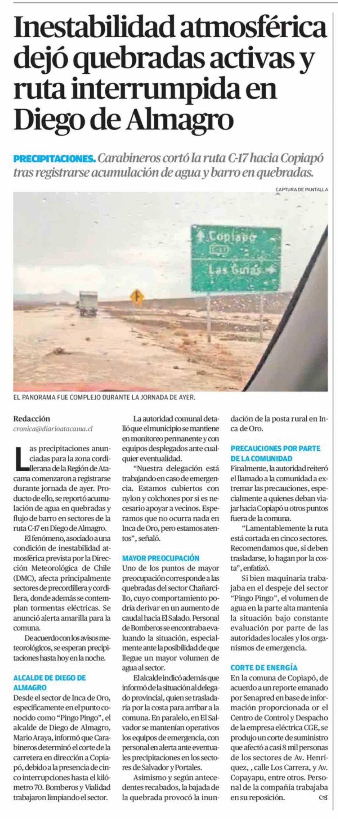 Inestabilidad atmosférica dejó quebradas activas y ruta interrumpida en Diego de Almagro