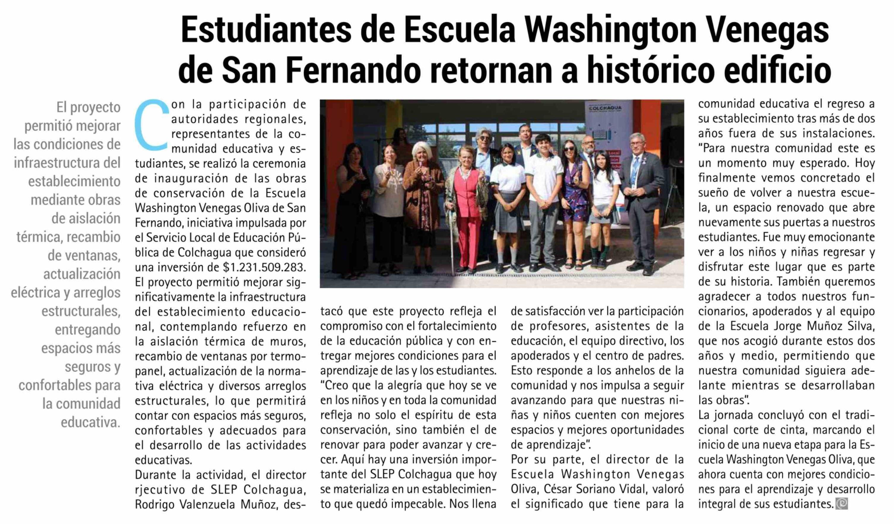 Estudiantes de Escuela Washington Venegas de San Fernando retornan a histórico edificio