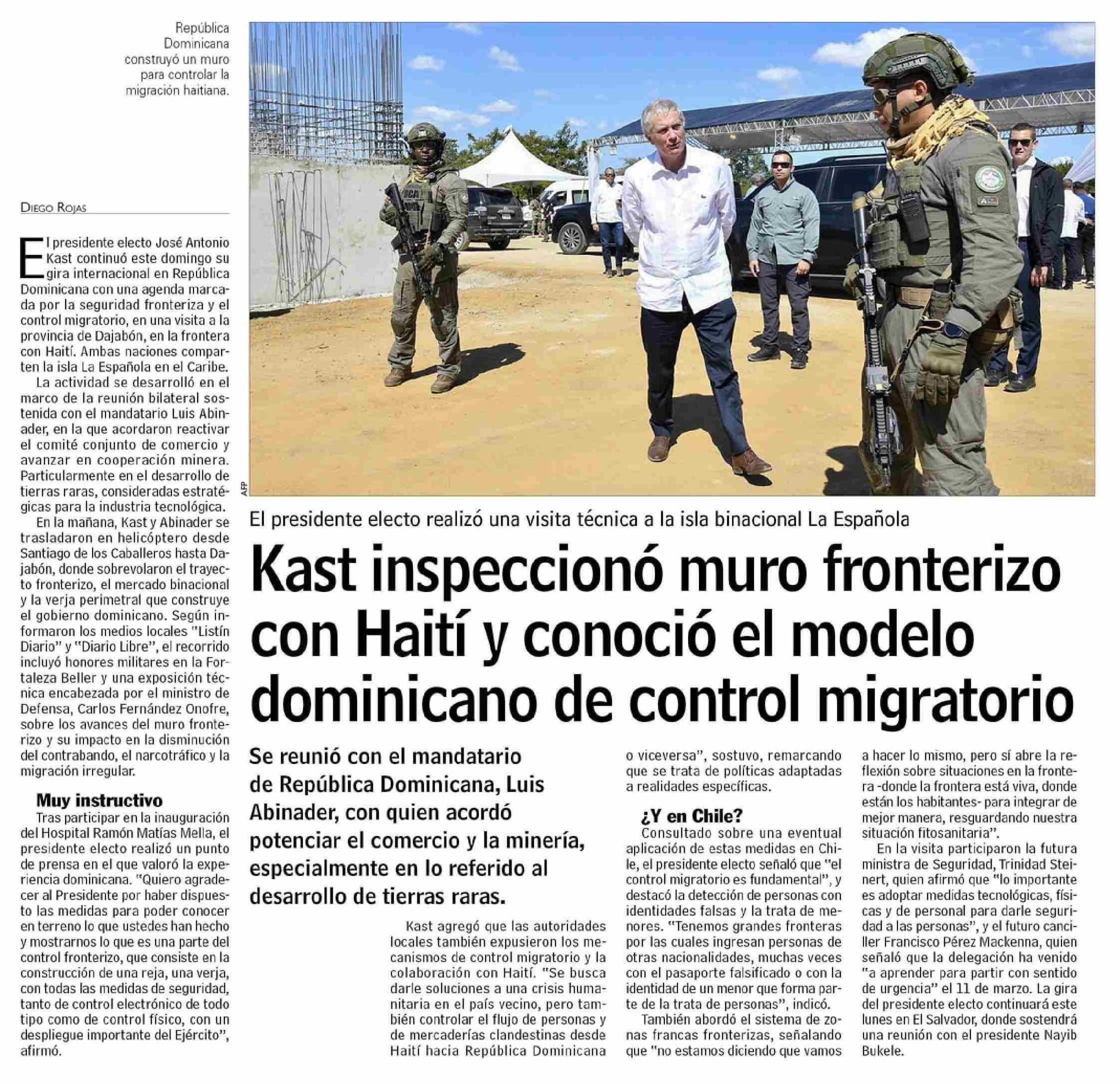 Kast inspeccionó muro fronterizo con Haití y conoció el modelo dominicano de control migratorio
