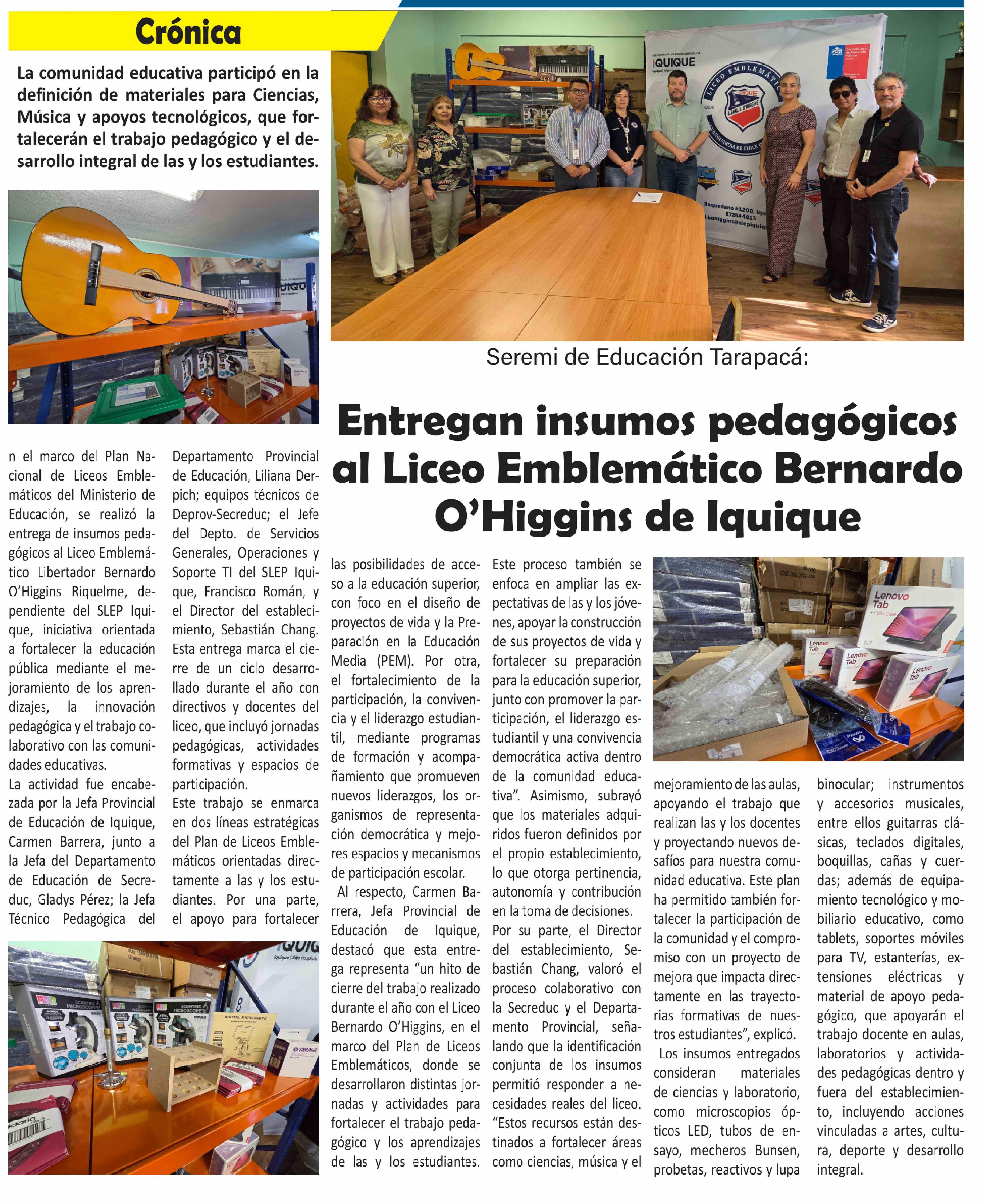 Entregan insumos pedagógicos al Liceo Emblemático Bernardo O'Higgins de Iquique