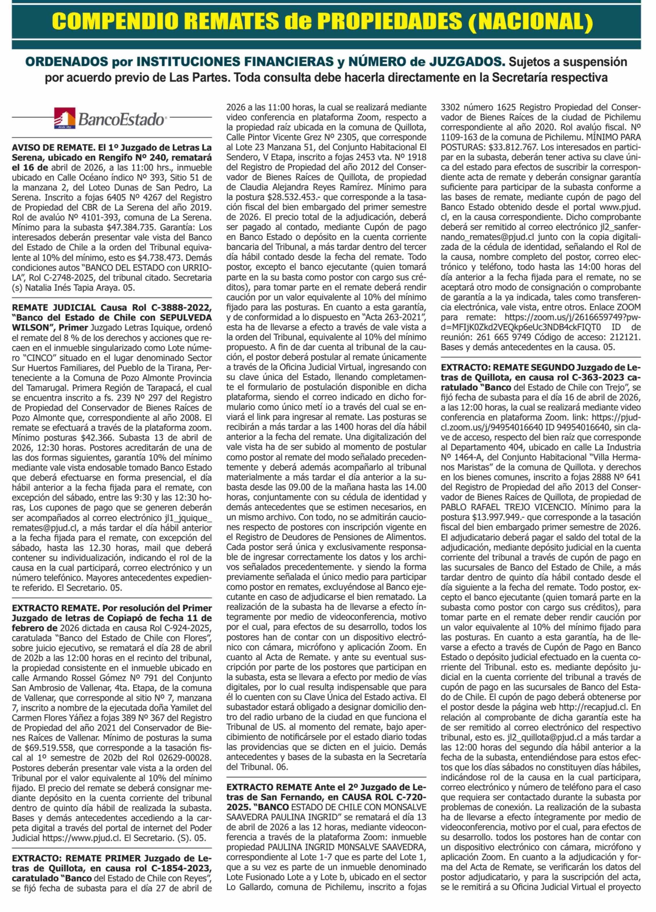 | Título: | Remates: COMPENDIO REMATES de PROPIEDADES (NACIONAL) |