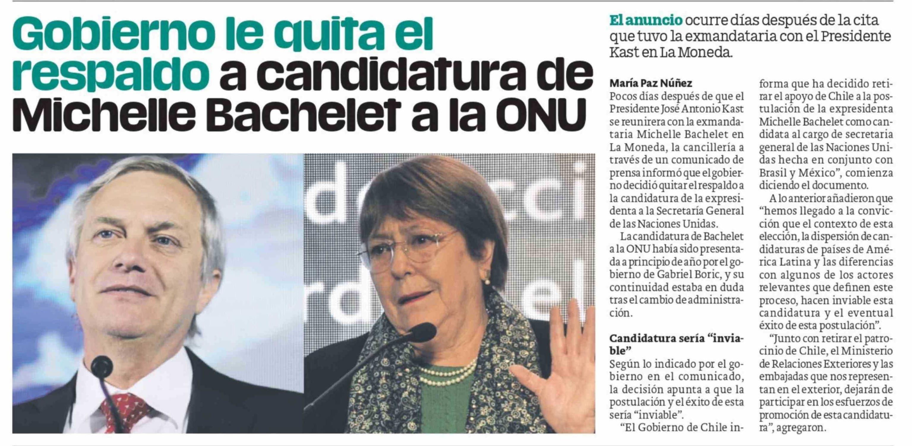 Gobierno le quita el respaldo a candidatura de Michelle Bachelet a la ONU