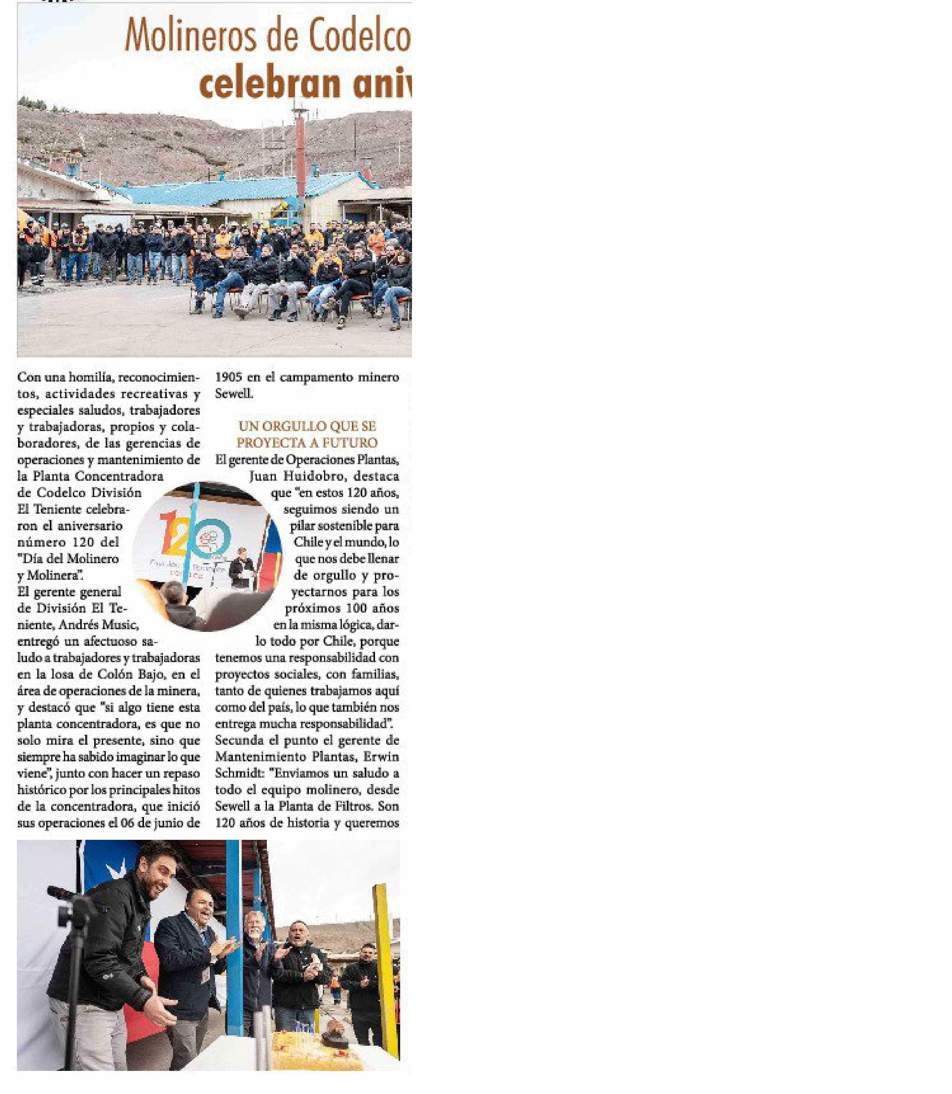 Molineros de Codelco División El Teniente celebran aniversario 120