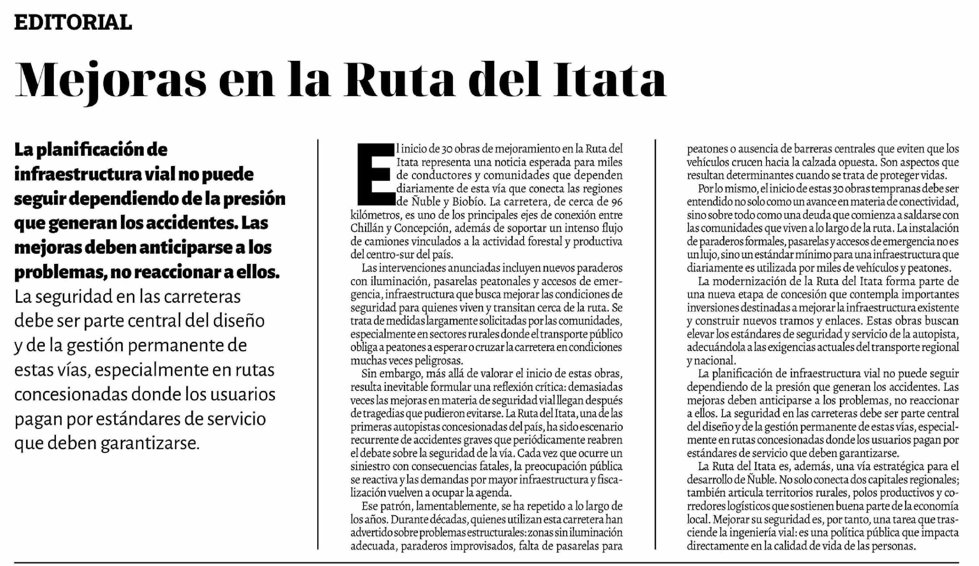Editorial: Mejoras en la Ruta del Itata
