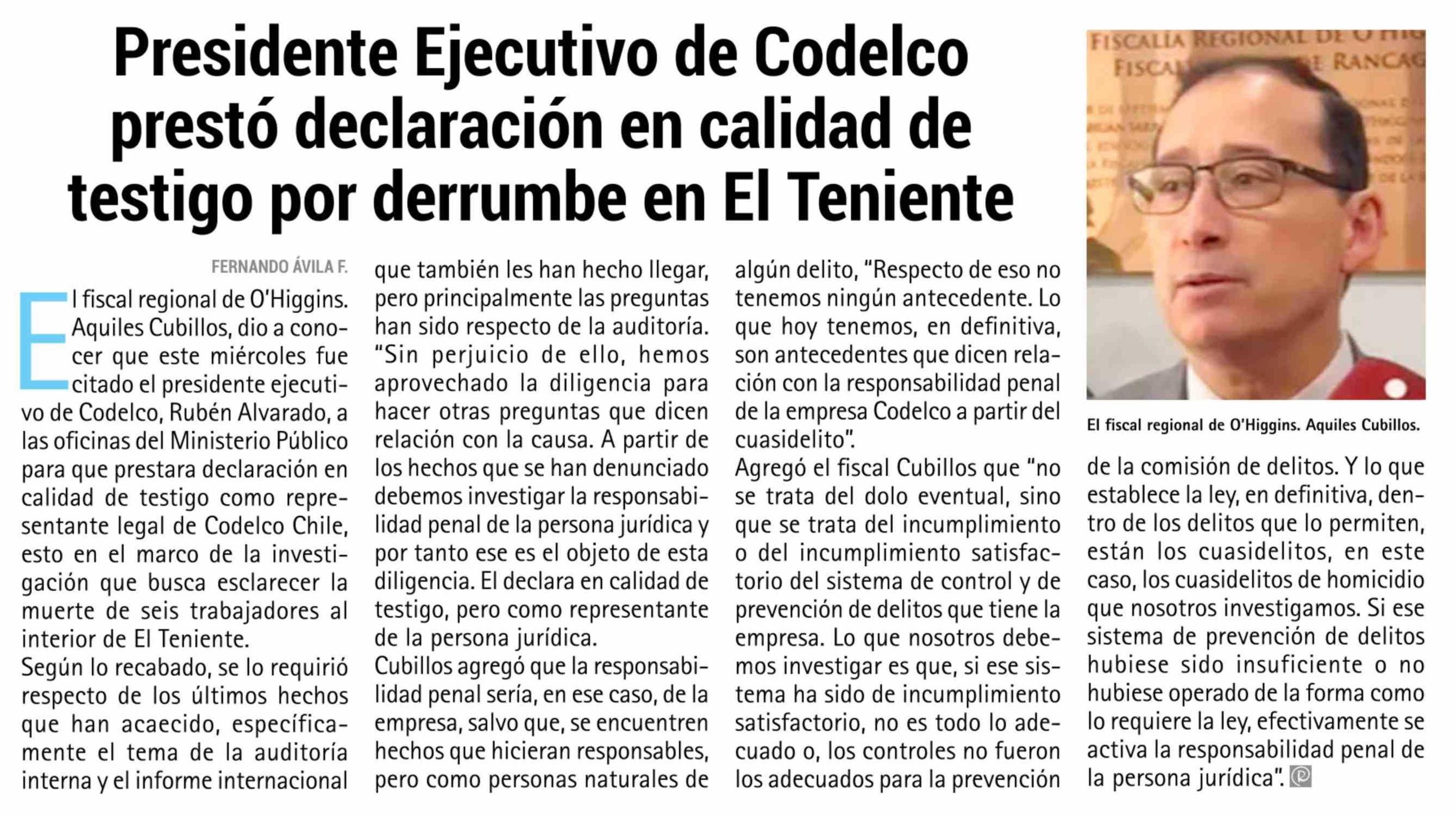 Presidente Ejecutivo de Codelco prestó declaración en calidad de testigo por derrumbe en El Teniente
