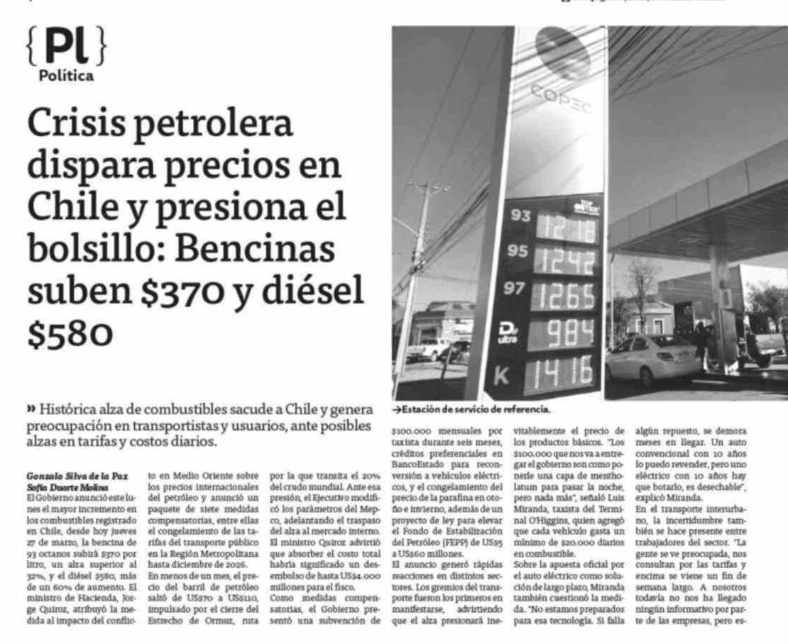 Crisis petrolera dispara precios en Chile y presiona el bolsillo: Bencinas suben $370 y diésel $580