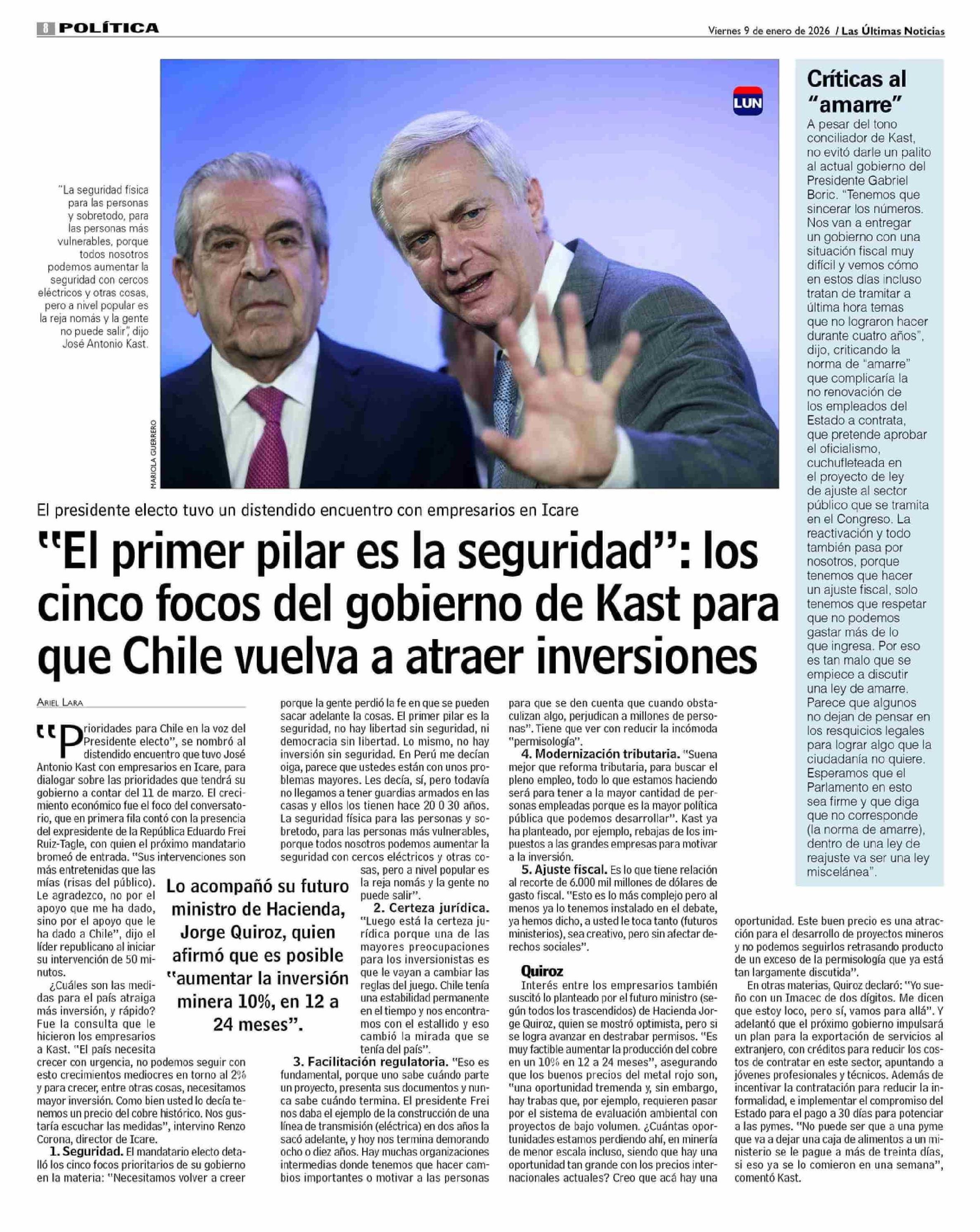 | Título: | “El primer pilar « es la seguridad”: los cinco focos del gobierno de Kast para que Chile vuelva a atraer inversiones |
