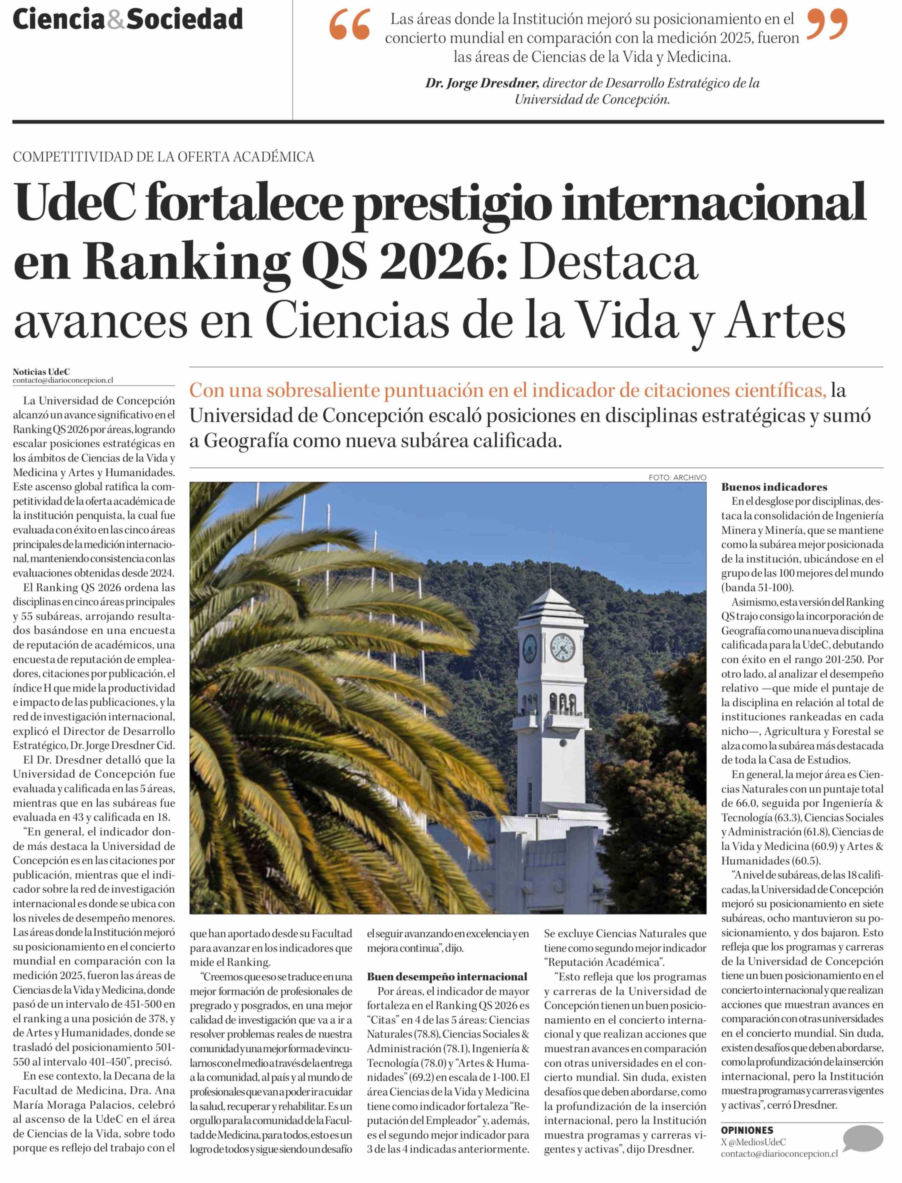 UdeC fortalece prestigio internacional en Ranking QS 2026: Destaca avances en Ciencias de la Vida y Artes