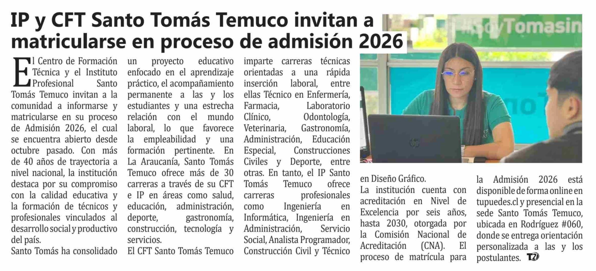 IP y CFT Santo Tomás Temuco invitan a matricularse en proceso de admisión 2026