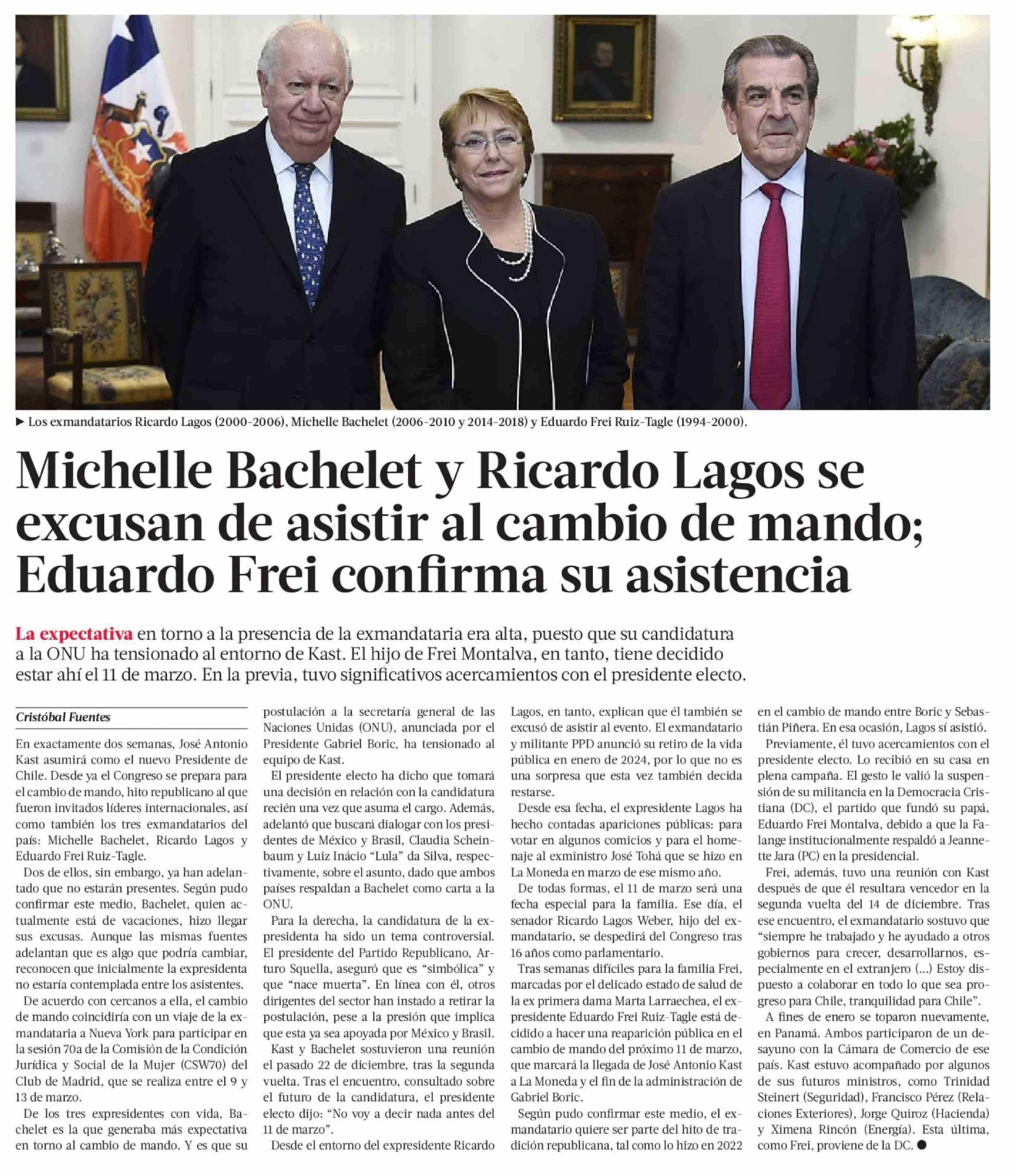 Michelle Bachelet y Ricardo Lagos se excusan de asistir al cambio de mando; Eduardo Frei confirma su asistencia