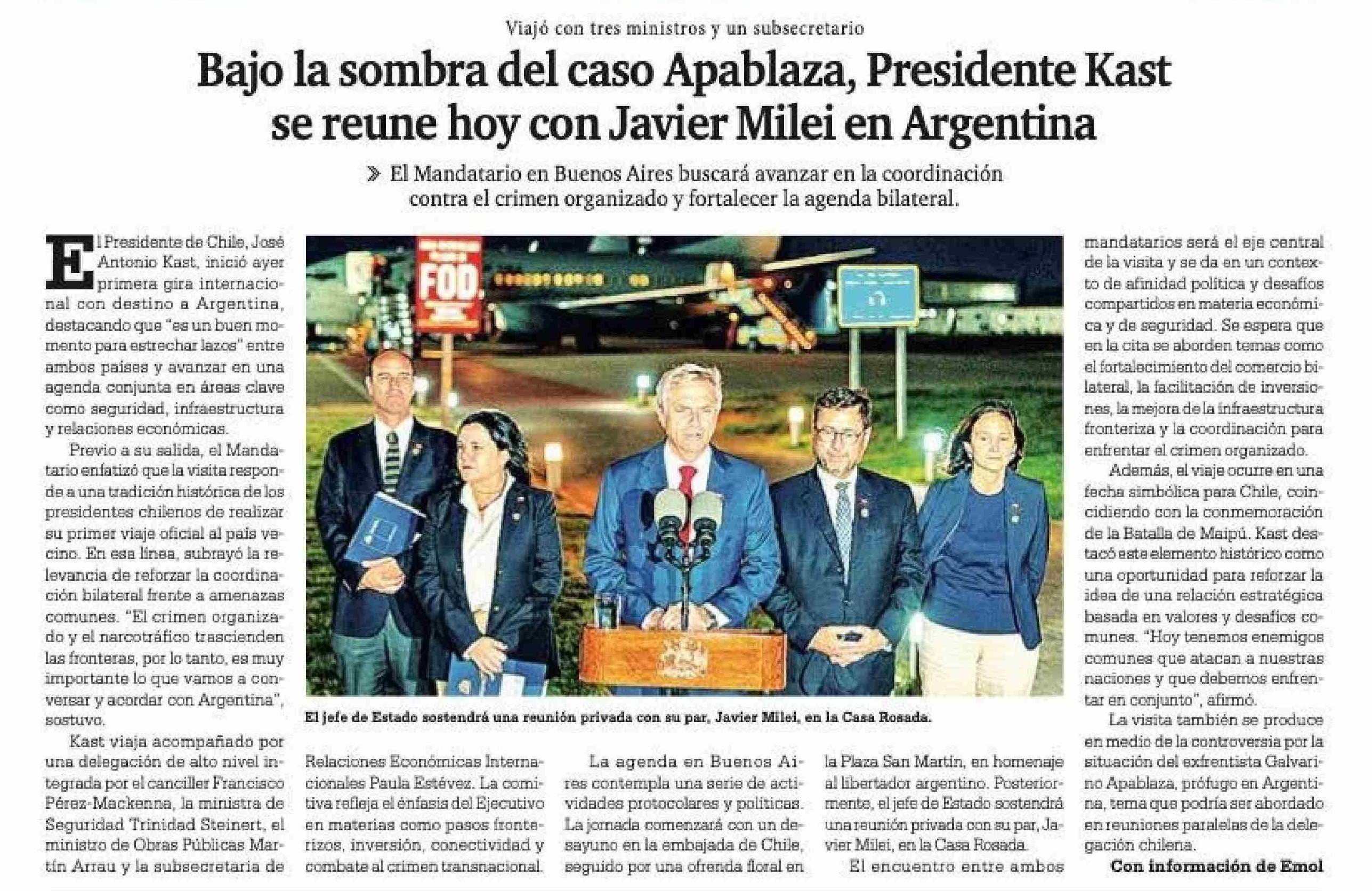 Bajo la sombra del caso Apablaza, Presidente Kast se reune hoy con Javier Milei en Argentina