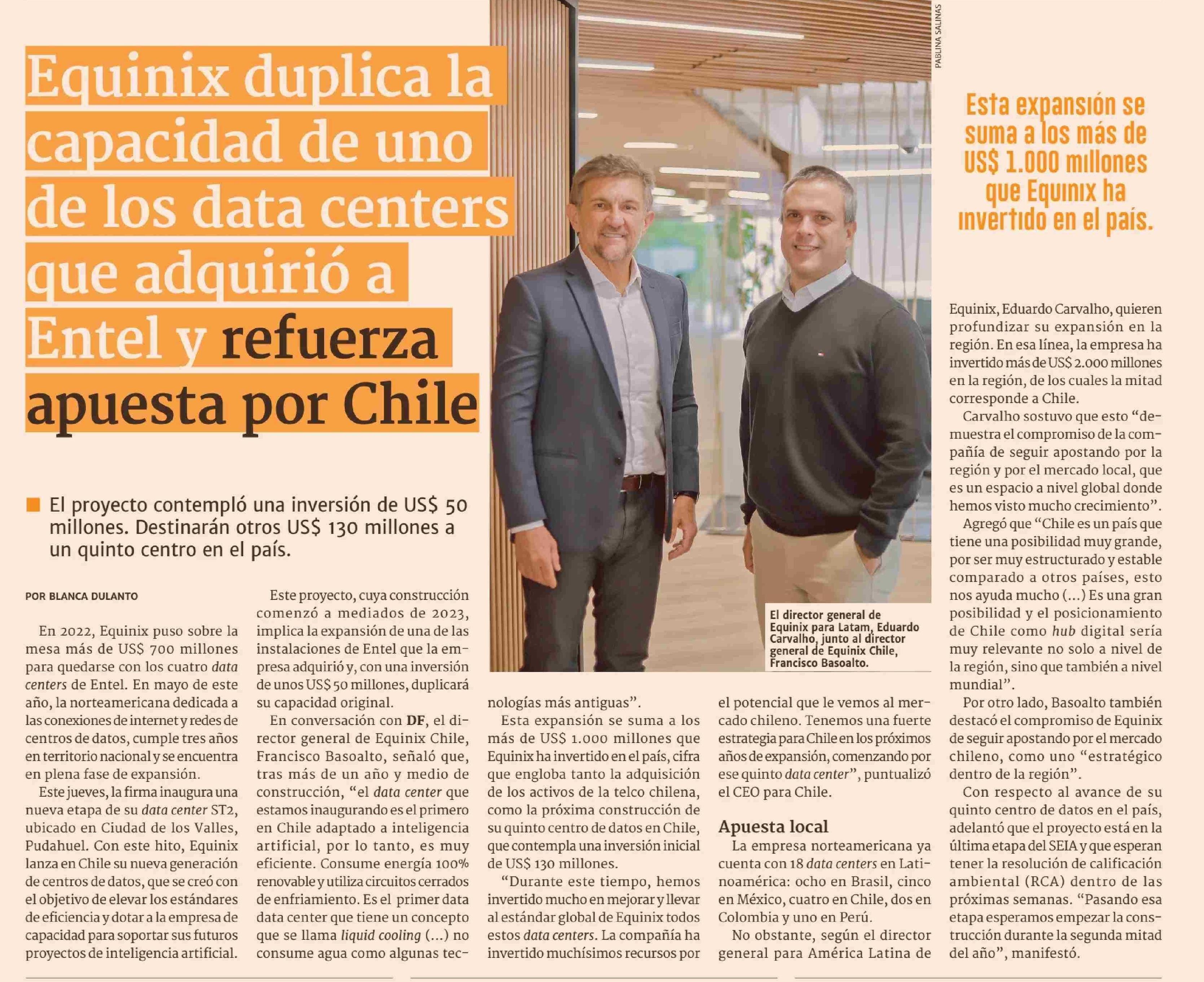 Equinix duplica la capacidad de uno de los data centers que adquirió a Entel y refuerza apuesta por Chile