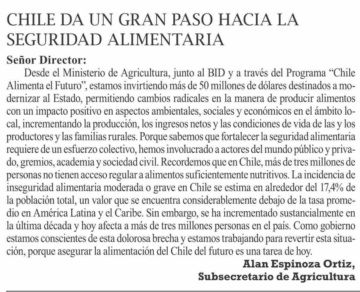 CARTAS: CHILE DA UN GRAN PASO HACIA LA SEGURIDAD ALIMENTARIA