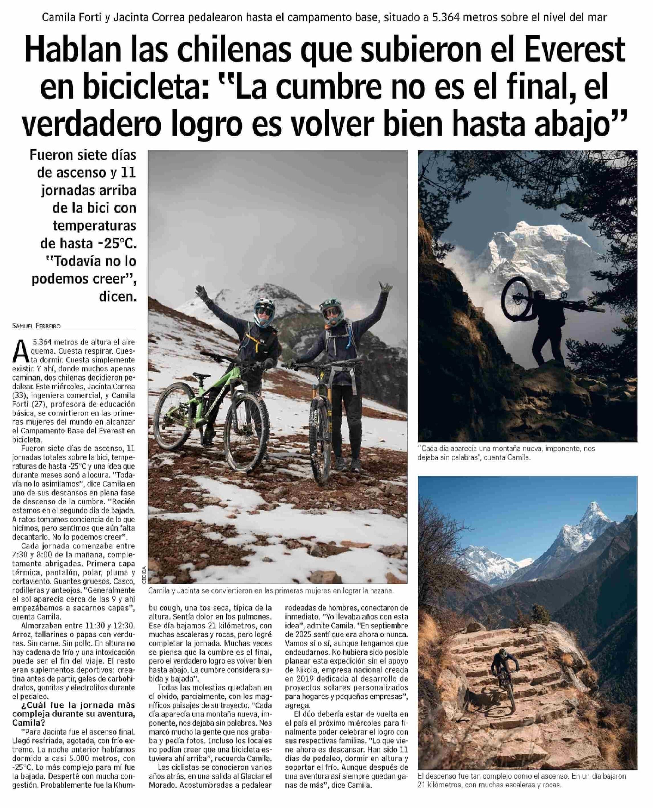 | Título: | Hablan las chilenas que subieron el Everest en bicicleta: "La cumbre no es el final, el verdadero logro es volver bien hasta abajo" |